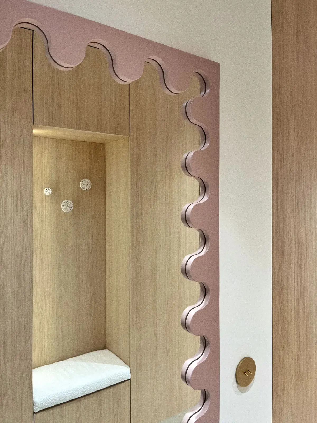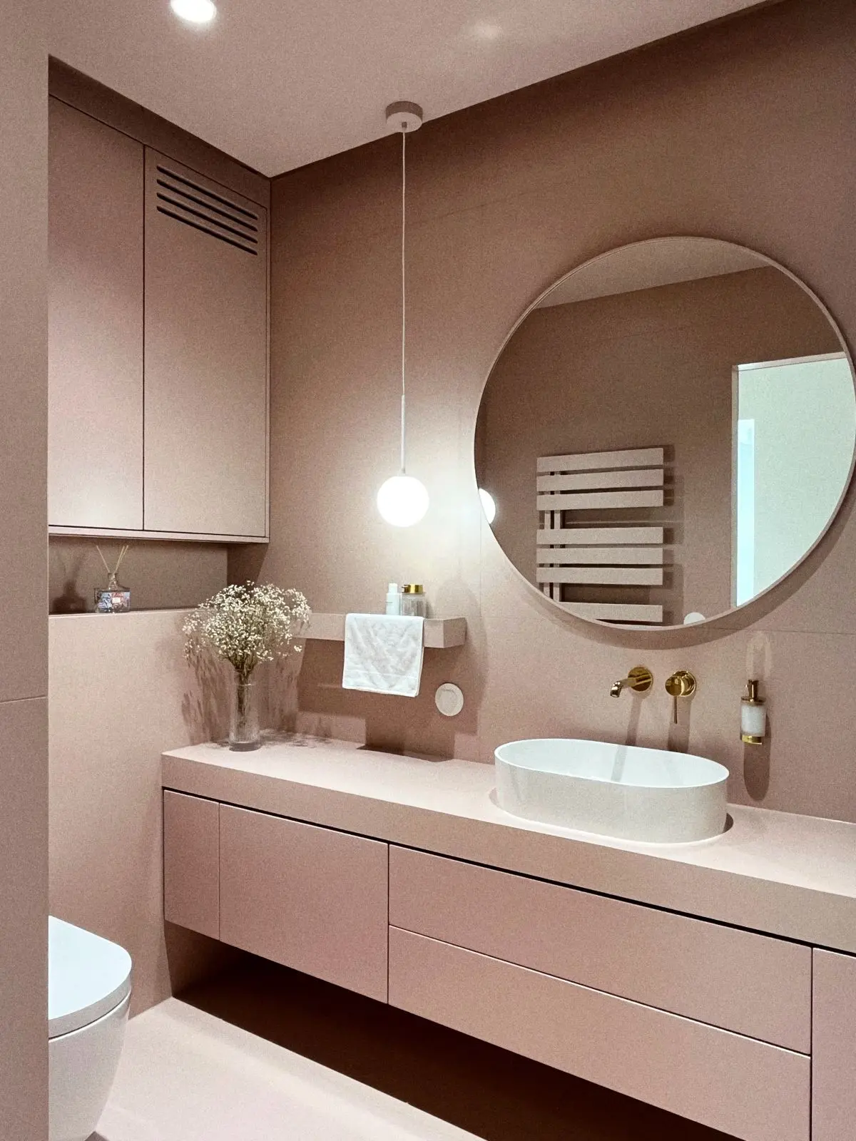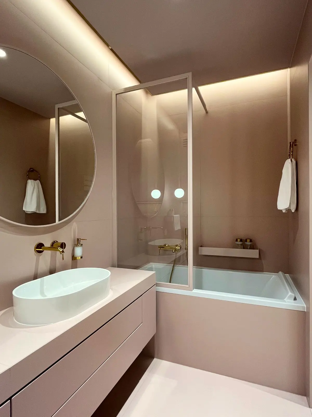 Złote baterie to element, który nadaje łazience elegancji i luksusu. Wybór złotej armatury wprowadza do wnętrza odrobinę blasku, jednocześnie pozostając w zgodzie z minimalistycznym charakterem łazienki. Złote akcenty doskonale komponują się z różowo-beżową kolorystyką, tworząc stylową i spójną całość.