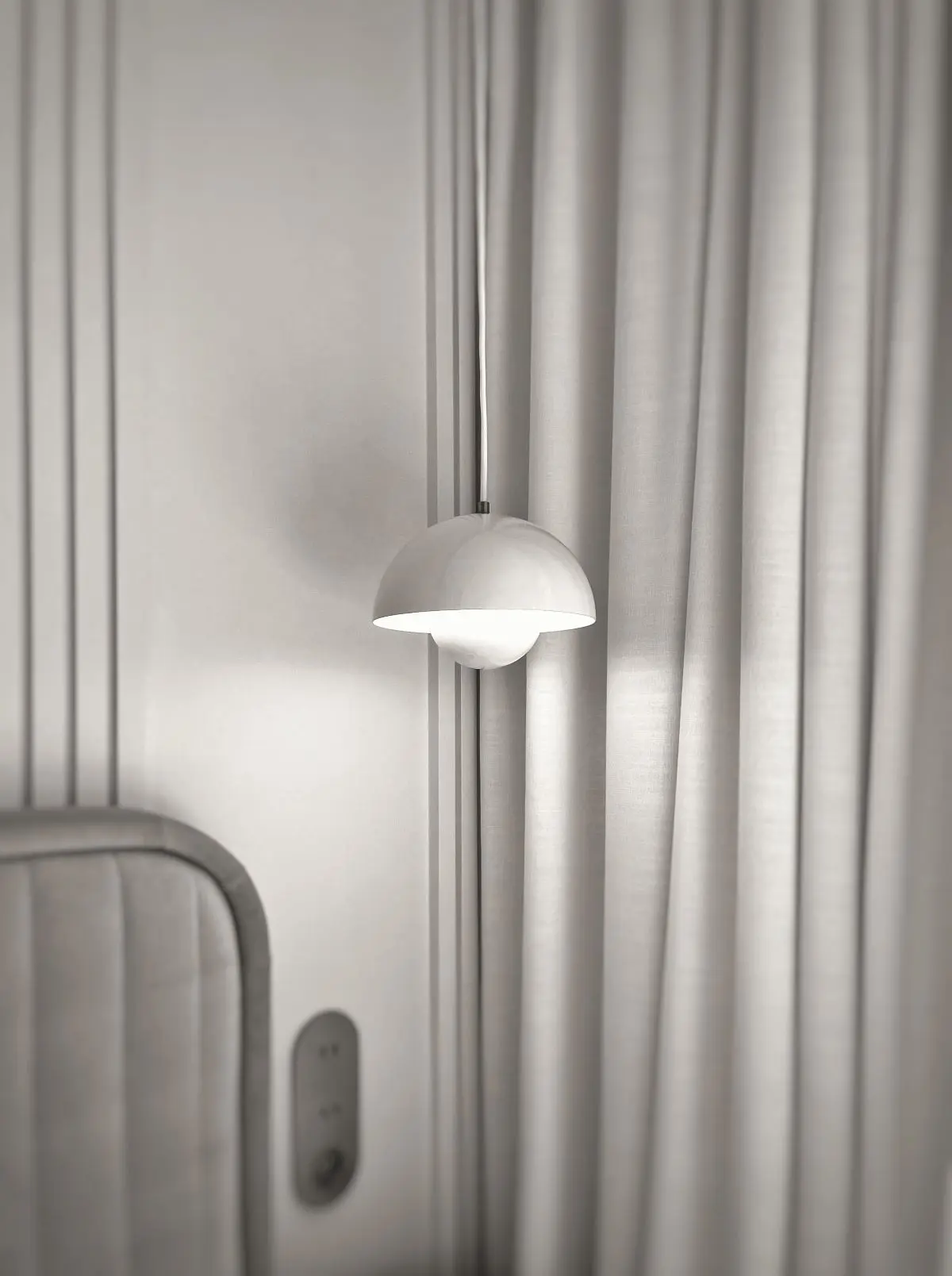 W centralnym punkcie salonu zawieszono designerską lampę marki &Tradition. Jej nowoczesny, a zarazem elegancki wygląd doskonale wpisuje się w stylistykę całego mieszkania. Oświetlenie odgrywa kluczową rolę w aranżacji wnętrz, a dobrze dobrane lampy mogą zdziałać cuda, nadając przestrzeni wyjątkowego klimatu.