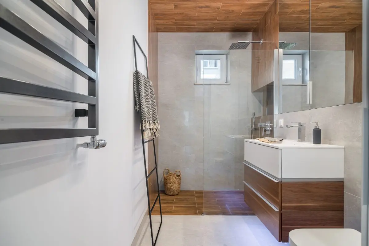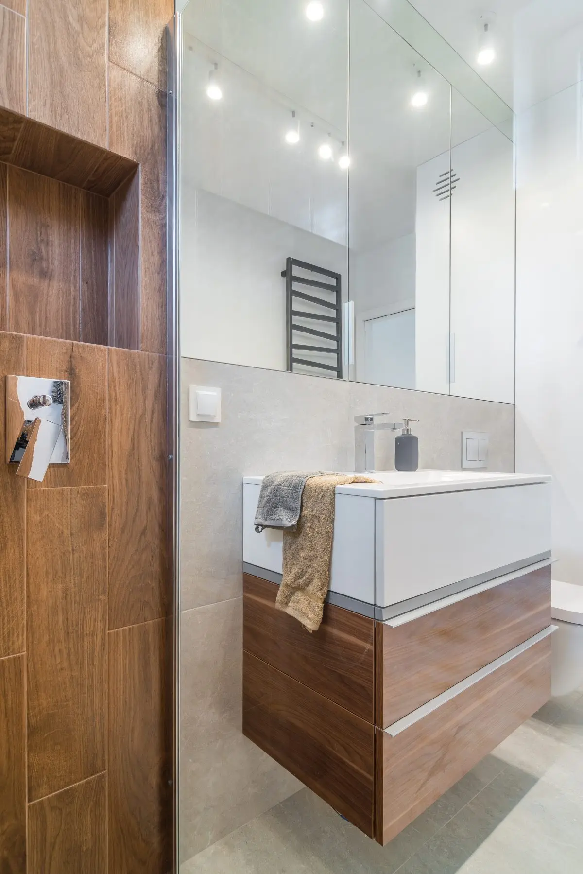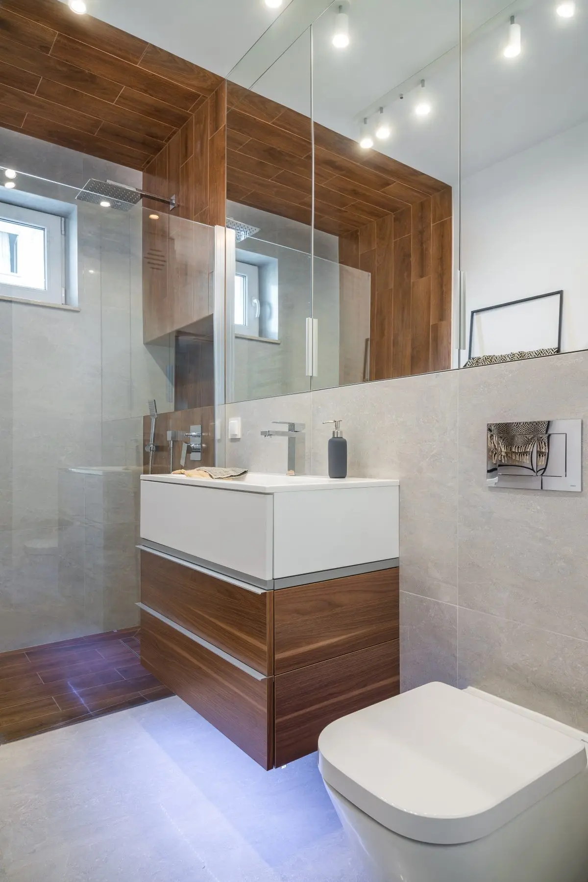 W łazience wydzielono dwie strefy prysznicową i umywalkową za pomocą geometrycznej instalacji z płytek drewnopodobnych. Dzięki oświetleniu reflektorowemu możemy sami kreować dowolnie klimat w pomieszczeniu.