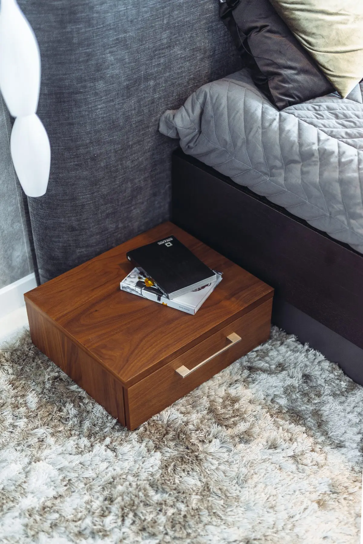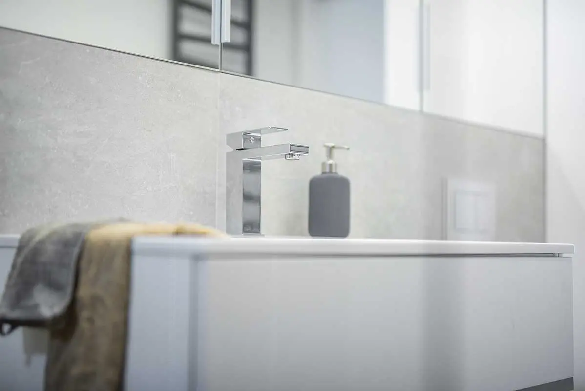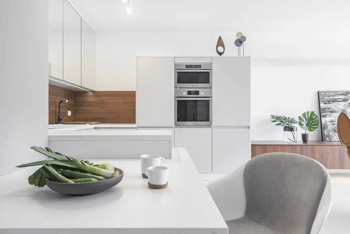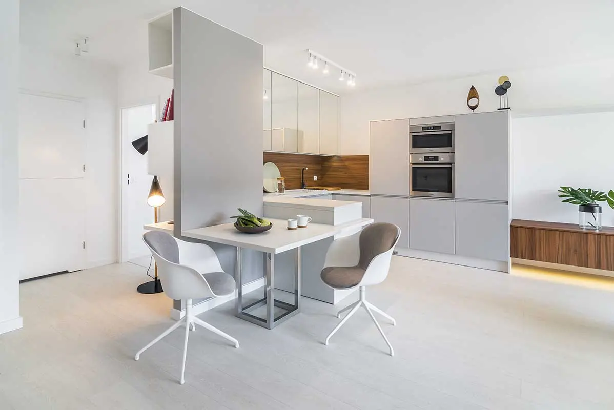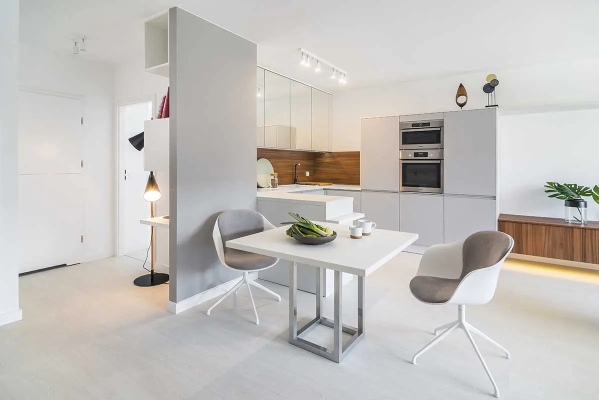 Mieszkanie o metrażu 61,5 m2 znajdujące się we Wrocławiu, to kwintesencja elegancji, nowoczesności połączona z dobrym stylem. Odnajdziemy tu również elementy stylu minimalistycznego z kreatywnymi rozwiązaniami, do których należy zastosowanie lustrzanych frontów w łazience, jak również w kuchni. Dodają wspaniałego efektu przestronności wnętrzu, jak i blasku. Stół na otwartej przestrzni, między kuchnią a salonem jest ruchomy, co daje możliwość łatwej zmiany aranżacji wnętrza.