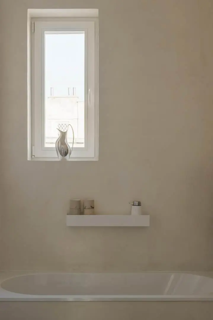 Łazienka z oknem urządzona jest ascetycznie i monochromatycznie.