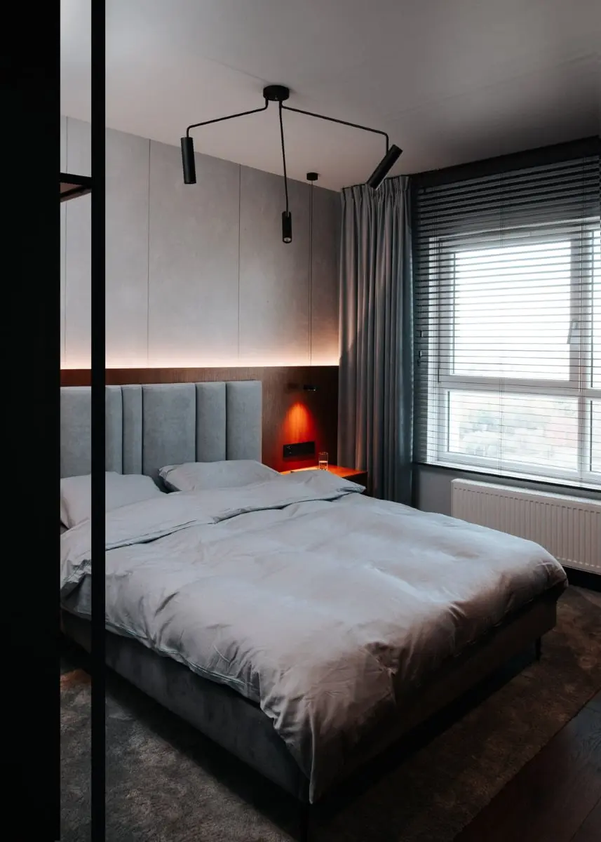 Na życzenie inwestorów sypialnia inspirowana jest estetyką hotelową. Przestrzeń nocna podkreślona została wykładziną, a z dawnego korytarza wydzielono niedużą garderobę przechodnią. Całość jest spójna dzięki starannie dobranemu minimalistycznemu oświetleniu. Nie zabrakło też miejsca do pracy oraz mini toaletki. Jasny i neutralny pokój dla córeczki stanowił wyjątek od dominującej kolorystyki. Okna zdobią drewniane żaluzje naściennymi, które dodają uroku i kontrolują przepływ światła.
