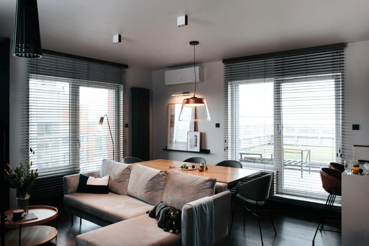 Lokal o powierzchni 80m2 znajduje się na najwyższej kondygnacji budynku i posiada duże okna, dzięki czemu do wnętrza wpada mnóstwo naturalnego światła. Pozwoliło to użyć w aranżacji ciemnych barw i materiałów wykończeniowych tj. płytki o teksturze betonu, tynki dekoracyjne, industrialne elementy czy drewno w głębokim wybarwieniu. Salon z aneksem łączy ze sobą wiele funkcji. Mimo niedużej przestrzeni znalazło się miejsce dla sofy z szezlongiem, dużego rodzinnego stołu, oraz półwyspu kuchennego. Uwagę zwraca dekoracyjna ściana TV wykonana z ryflowanych płyt włóknocementowych oraz listew miedzianych.