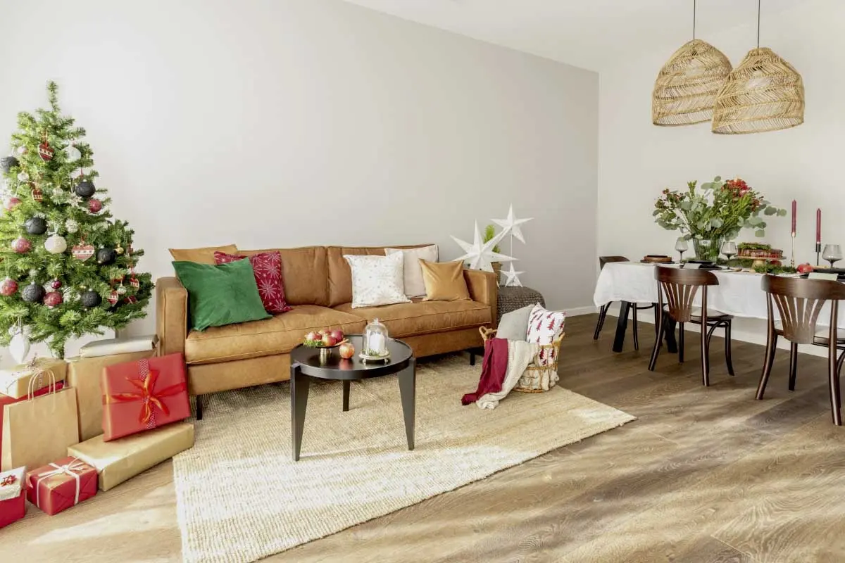 Klimat świąt wprowadzają dodatki korespondujące ze stylem wnętrza. Architekci uzyskali spójną całość poprzez wykorzystanie dekoracji z naturalnych materiałów: wikliny, trawy morskiej, lnu oraz wełny. Świąteczny nastrój dopełnia tradycyjna bożonarodzeniowa kolorystyka czyli zieleń i czerwień. Dodatki nie wysuwają się na pierwszy plan, ale z wdziękiem wprowadzają świąteczną atmosferę. Subtelnym i przyjemnym dla oka akcentem są dekoracje w postaci liści eukaliptusa w salonie, kuchni i w łazience. Kompozycje naturalnych roślin, ozdobne gwiazdy oraz subtelne dekoracje w świątecznych barwach, świetnie wpisały się w oszczędny wystrój salonu, inspirowany stylem boho i eko. Główne skrzypce gra tu wygodna sofa w kolorze karmelu. Tuż obok architekci wygospodarowali miejsce do spożywania posiłków. Nad sporym prostokątnym stołem zawisły plecione lampy. Jest to mocny akcent dekoracyjny wnętrza, który doskonale współgra z dywanem z juty i podłogą z ręcznie postarzanych dębowych desek. Naturalne dekoracje: pachnące gałązki świerku, włoskie orzechy, czerwone jabłka i owoce granatu, tworzą swobodną atmosferę świątecznego posiłku. Dzięki nim stół prezentuje się szykownie i odświętnie.
