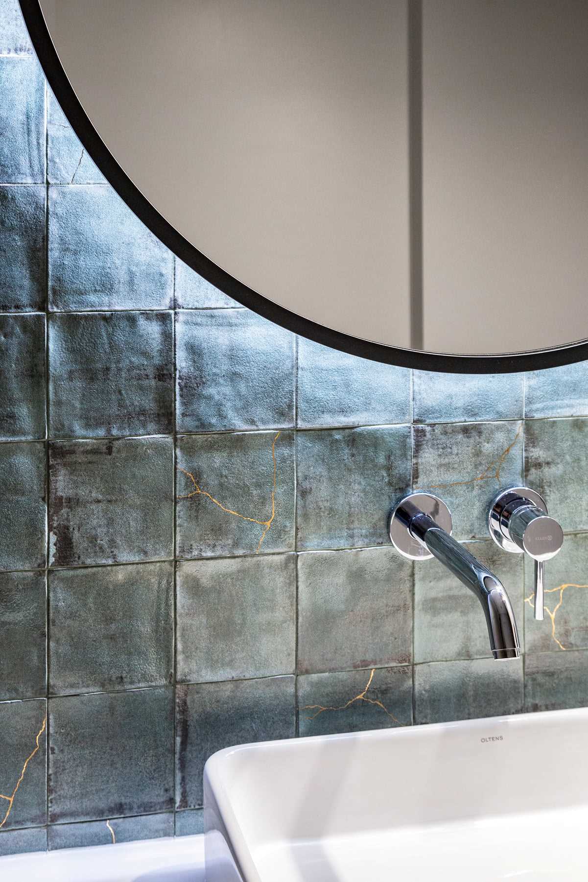 W tym projekcie mamy oszczędność form, funkcjonalność, jasną, rozświetloną przestrzeń urządzoną najpotrzebniejszymi meblami, bez nadmiaru dekoracyjnych detali i krzykliwych kolorów. Indywidualność tego wnętrza podkreślają zjawiskowe i jedyne w swoim rodzaju niebieskie z żyłkami złota płytki Wow Design z kolekcji ENSO.