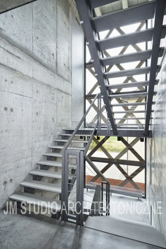 Elewacja to blacha kortenowa, beton architektoniczny, stal oraz gabiony wszystko to nawiązuję do materiałów używanych w budownictwie inżynieryjnym. Materiały te nie wymagają konserwacji. Gdzieniegdzie olbrzymie przeszklenia dzięki, którym cały budynek nabiera lekkości. Wnętrze staję się częścią architektury, a elewacja częścią wnętrza.