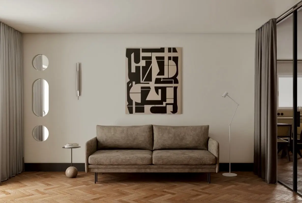 Minimalistyczną bazę aranżacji wypełniają rzeźbiarskie formy. Meble niczym dzieła sztuki stają się główną dekoracją wnętrza. Kadry wnętrz przypominające obrazy prowadzą swojego rodzaju narrację, nadając ton ogólnej kompozycji. Ważnym elementem wystroju są także lustra, które dodatkowo optycznie powiększają oraz doświetlają pomieszczenia ze słabym dostępem do światła.