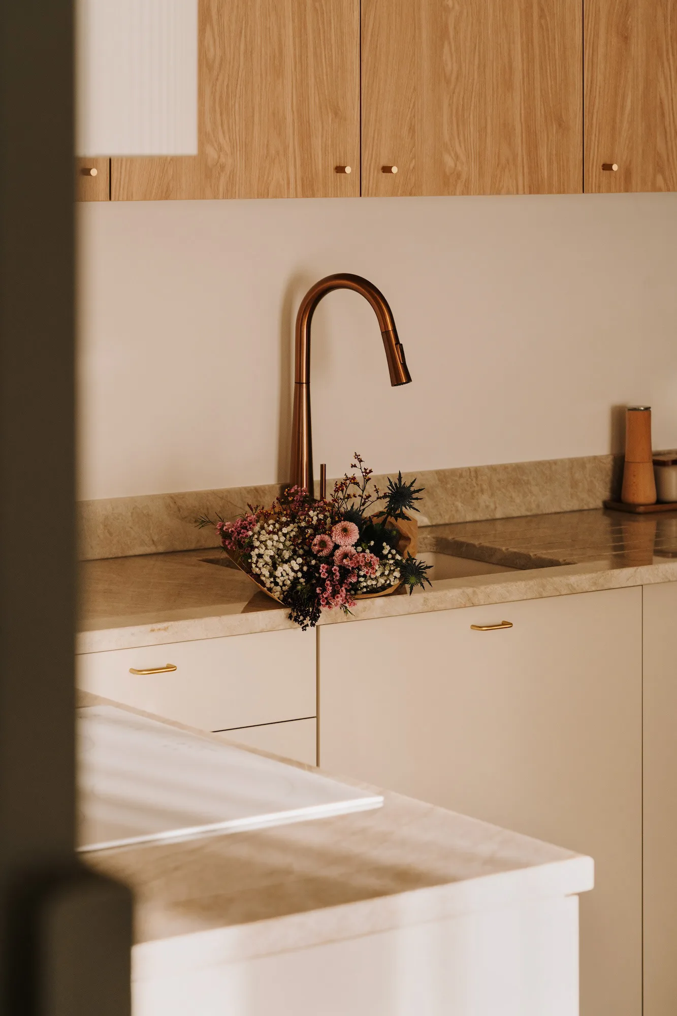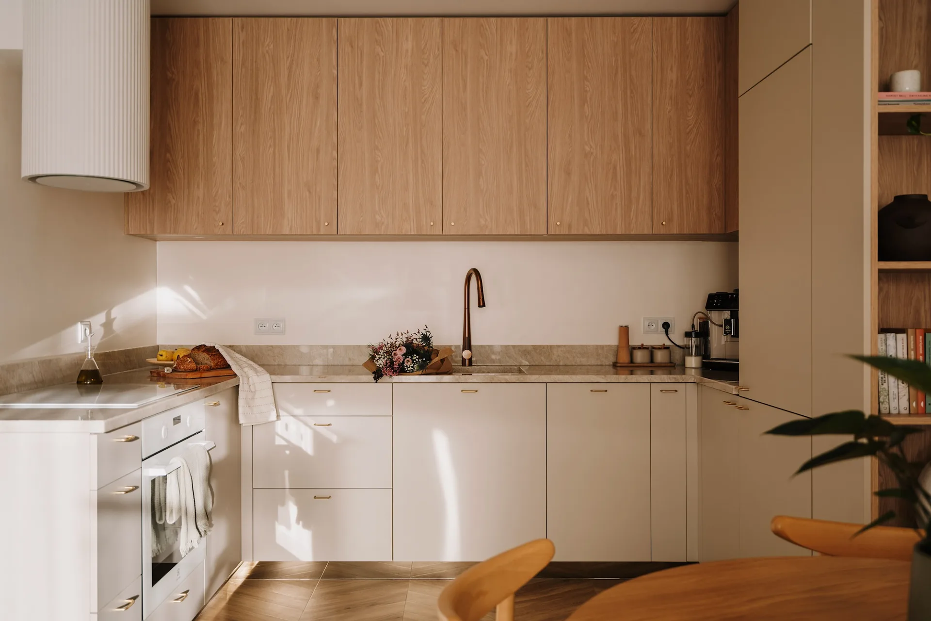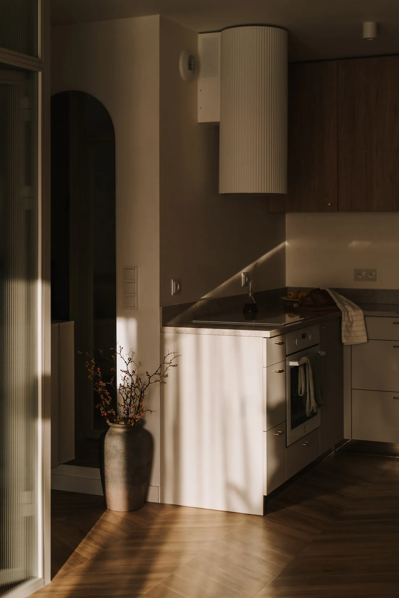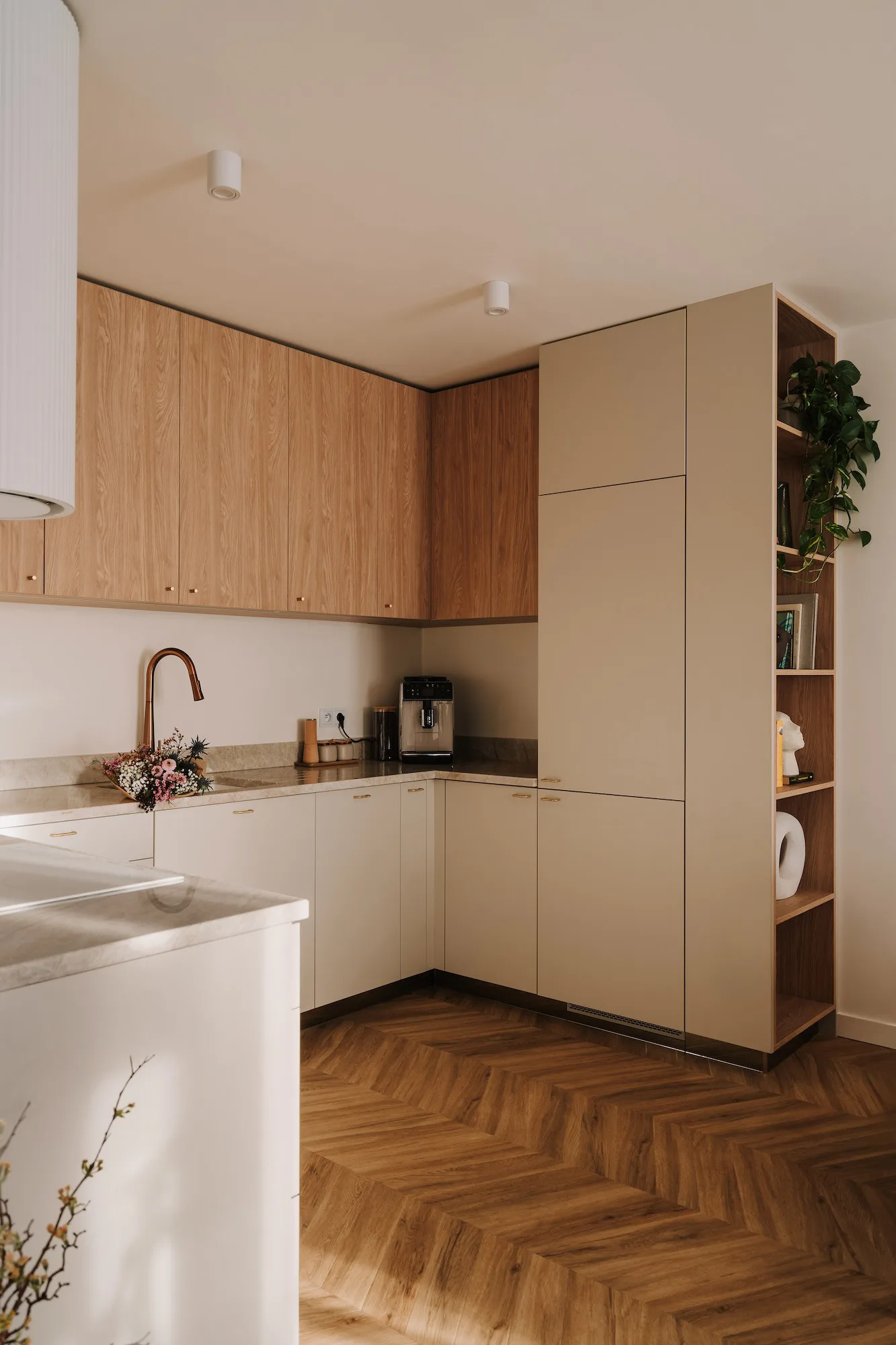W otwartej strefie dziennej znajduje się niewielki aneks kuchenny w kształcie litery ,,U”. Tu również pierwsze skrzypce odgrywa ponadczasowe połączenie płyty drewnopodobnej oraz prostych szaro – beżowych frontów, które udekorowano biżuteryjnymi uchwytami w kolorze szczotkowanego złota. W tym samych wykończeniu jest bateria kuchenna. Szlachetny wyraz wnętrzu nadaje kamień na blacie płynnie przechodzący na ścianę.