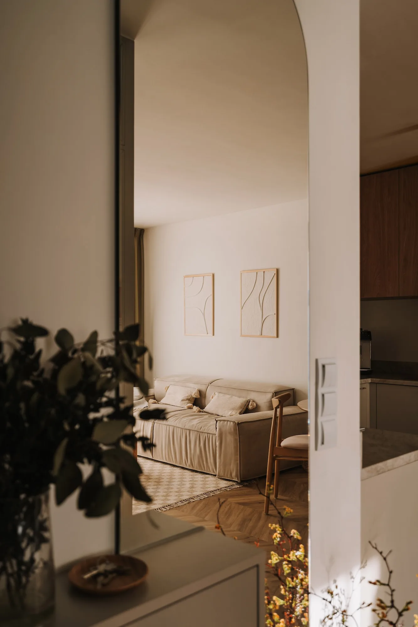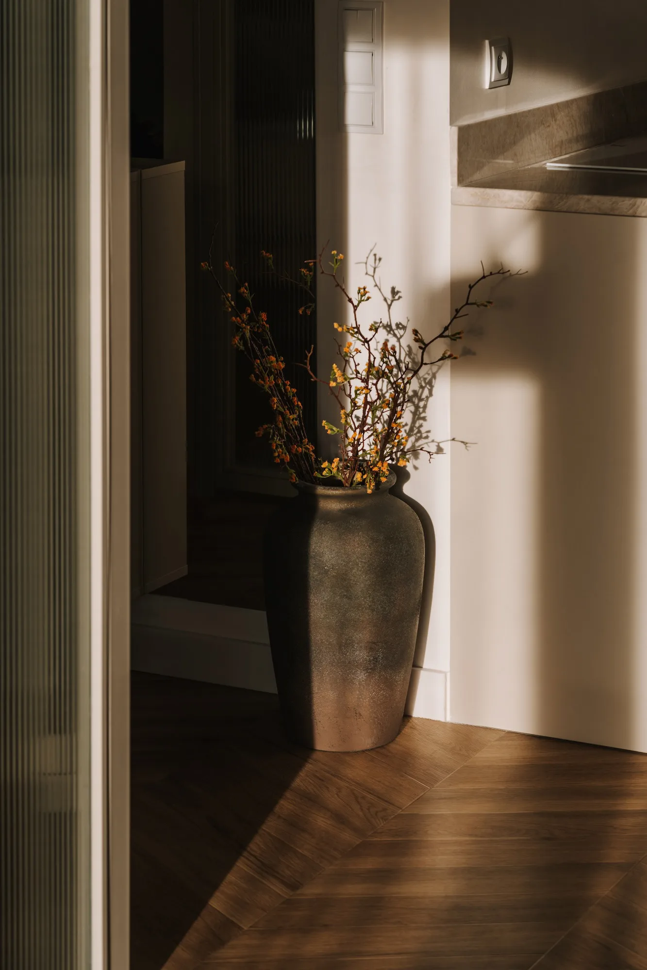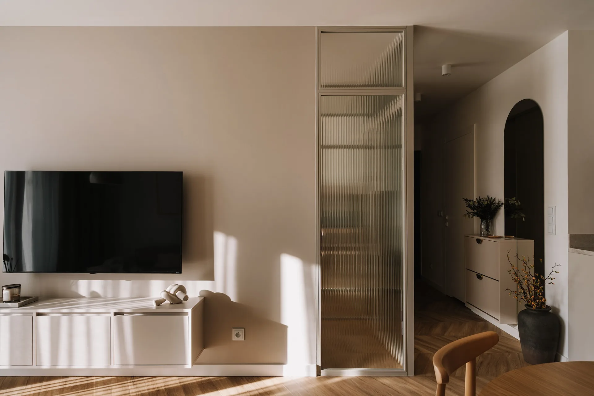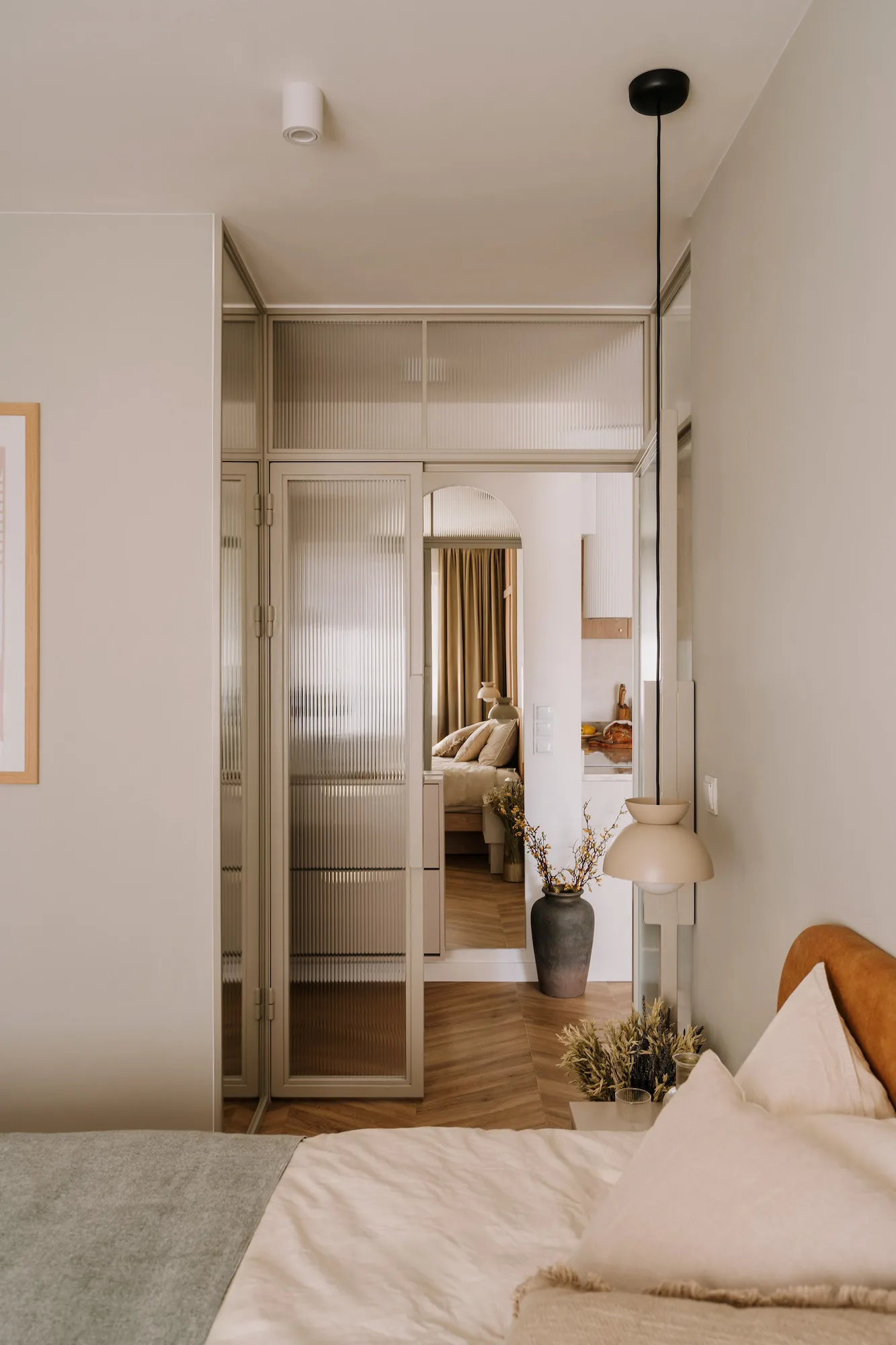 Siła dobrze dopracowanego projektu wnętrza tkwi w detalach, a ta realizacja jest tego doskonałym przykładem. Przemyślana kolorystyka, nieprzypadkowy motyw przewodni i funkcjonalność, która idzie w parze z estetyką. Warto zwrócić uwagę, że w tym mieszkaniu nie ma za dużo typowych dekoracji, są za to rozwiązania, które same przez się ubogacają wnętrze. Zaliczyć do nich możemy chociażby dekoracyjne oprawy, pełniące rolę oświetlenia typowo zadaniowego a pomimo to zachwycają formą a po zmroku tworzą wyjątkowo przytulny klimat. Tę samą rolę pełnią wszelkiego rodzaju przeszklenia z wykorzystaniem ornamentowanego szkła zamkniętego w subtelne metalowe konstrukcje.