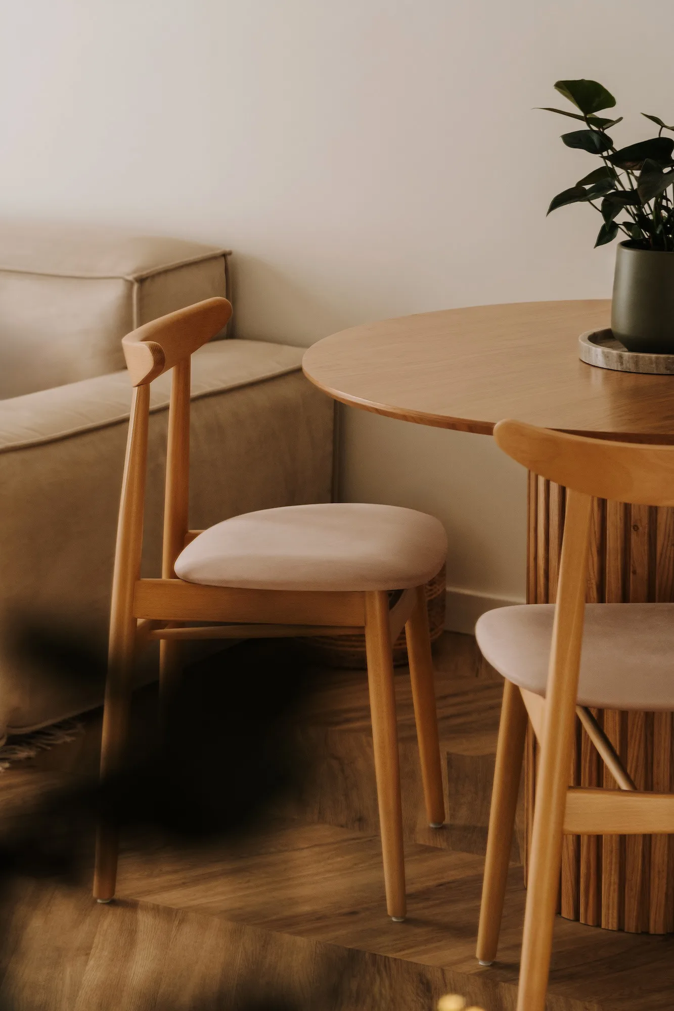 Pomiędzy kuchnią i salonem znalazł się okrągły stół z dekoracyjną ryflowaną nogą, Motyw ten architektka powiela na różne sposoby niemalże we wszystkich pomieszczeniach. Taki zabieg sprawił, że projekt jest pełen harmonii.