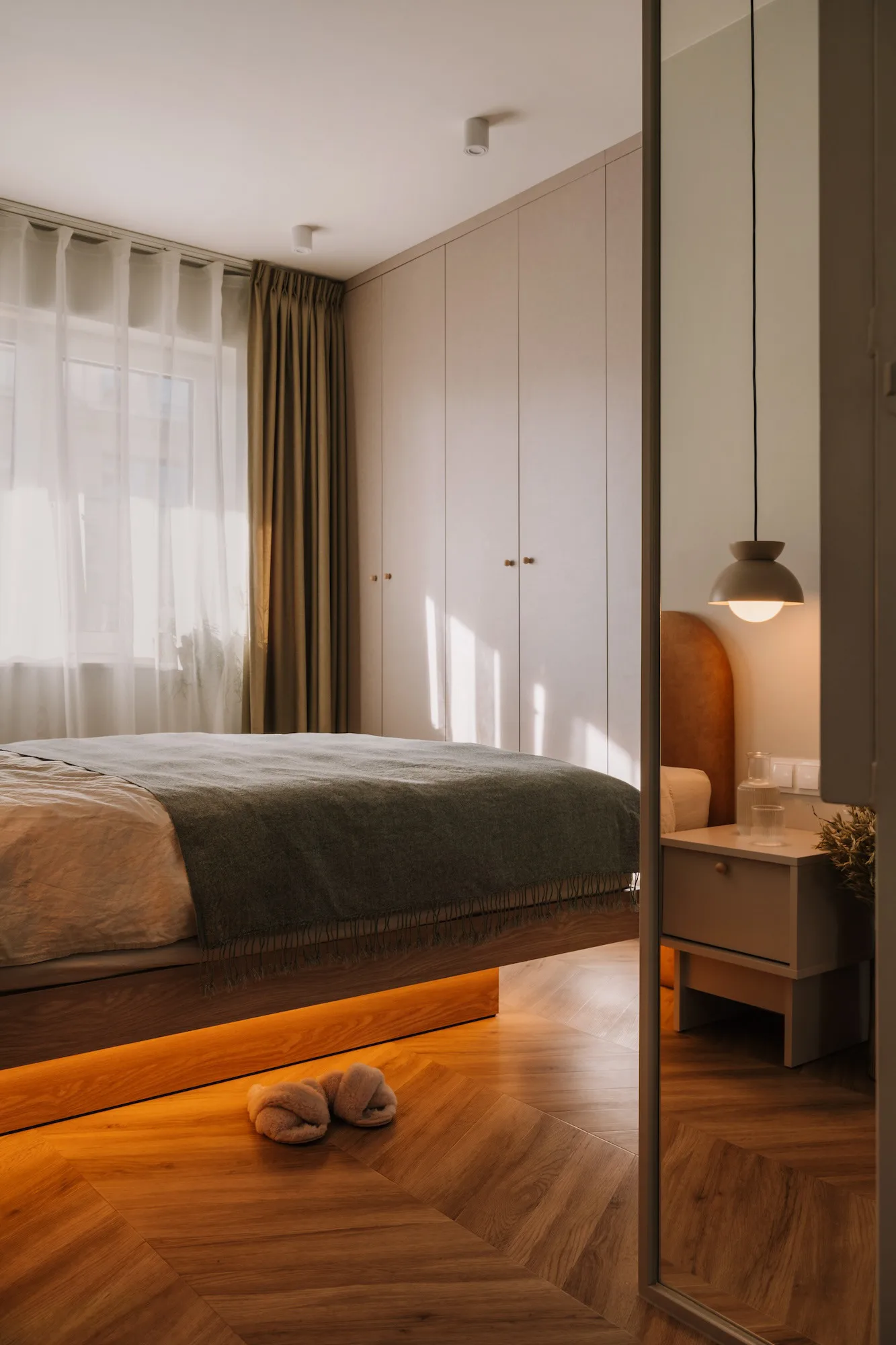 Podstawową teksturą w tym wnętrzu jest drewniana podłoga ułożona w jodełkę, która wyznacza rytm całej aranżacji. Wariację na temat jodełki powielono w strefie prysznicowej w łazience w formie płytek drewnopodobnych, które stanowią kontrapunkt dla jednolitych, aczkolwiek strukturalnych płytek, których fakturę podkreśla precyzyjnie zaprojektowane oświetlenie. Kontynuację ciepłej szarości ceramiki stanowi kaszmirowa, prosta zabudowa.