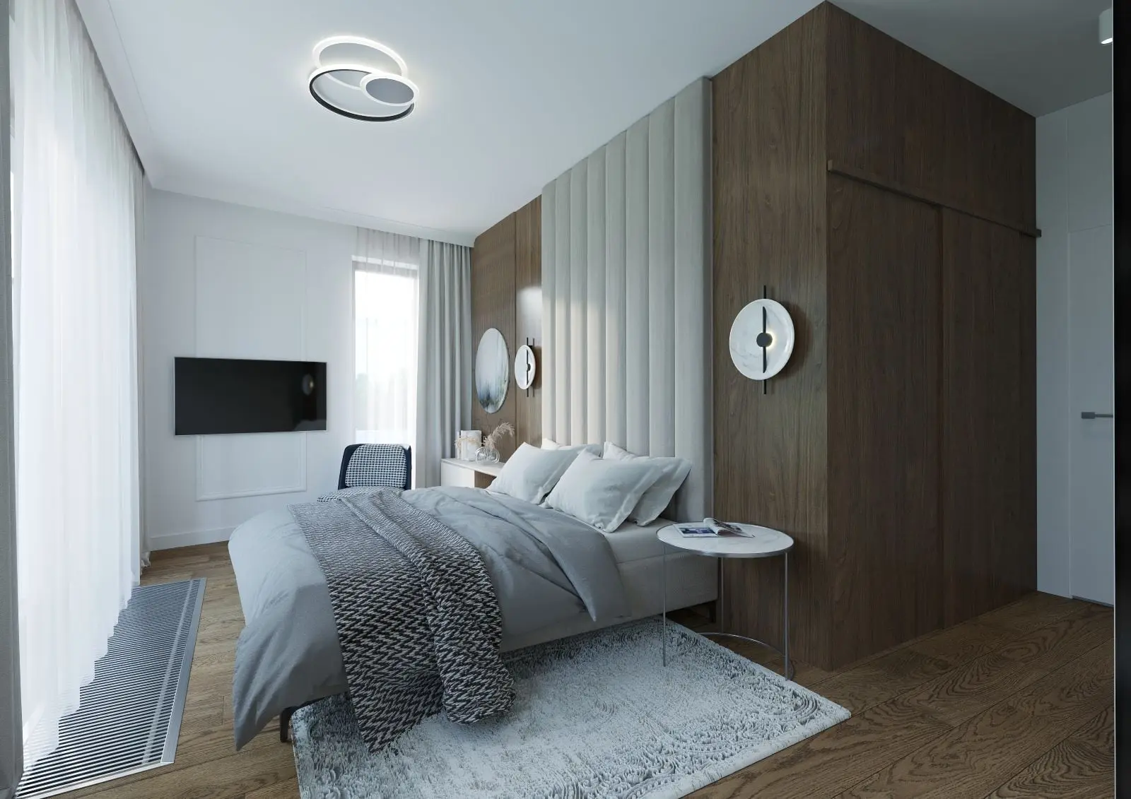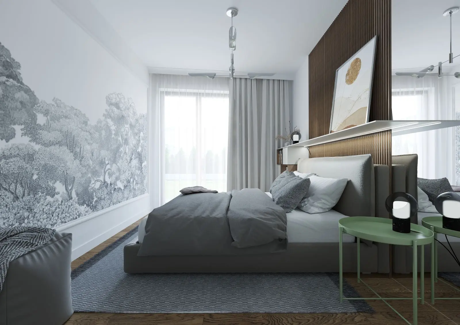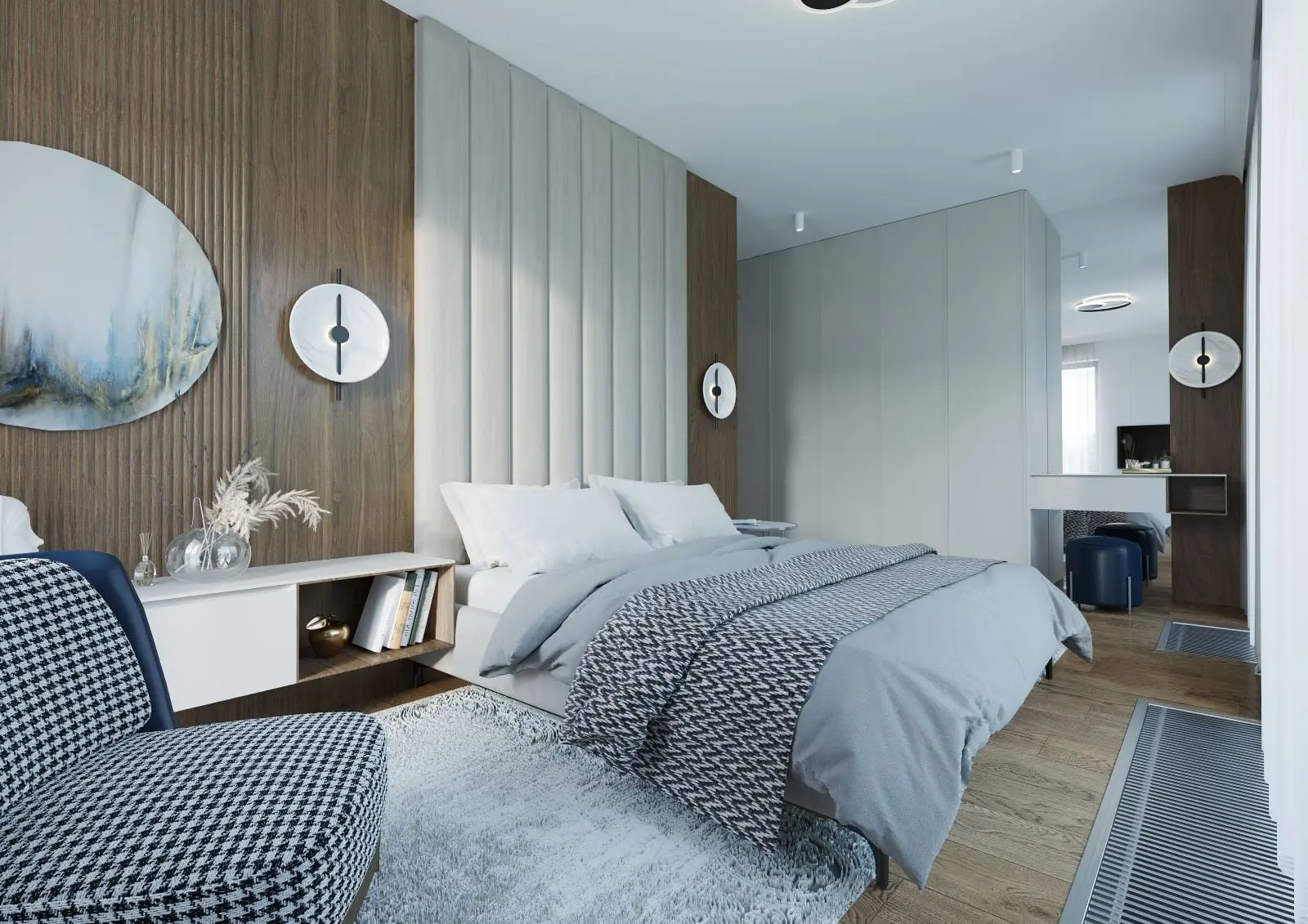 Druga część mieszkania to 70 metrów, które zostało podzielone na dwie sypialnie gościnne oraz sypialnię masters z niewielką łazienką. Duże wygodne łóżko jest tu centralnym punktem wnętrza. Natomiast ściana za łóżkiem została wykończona miękkimi panelami tapicerowanymi, które z drewnianą ścianą z lameli tworzą ciekawą harmonijną kompozycję. W strefie wypoczynkowej znajduję się również fotel, gdzie można relaksować się i czytać.
