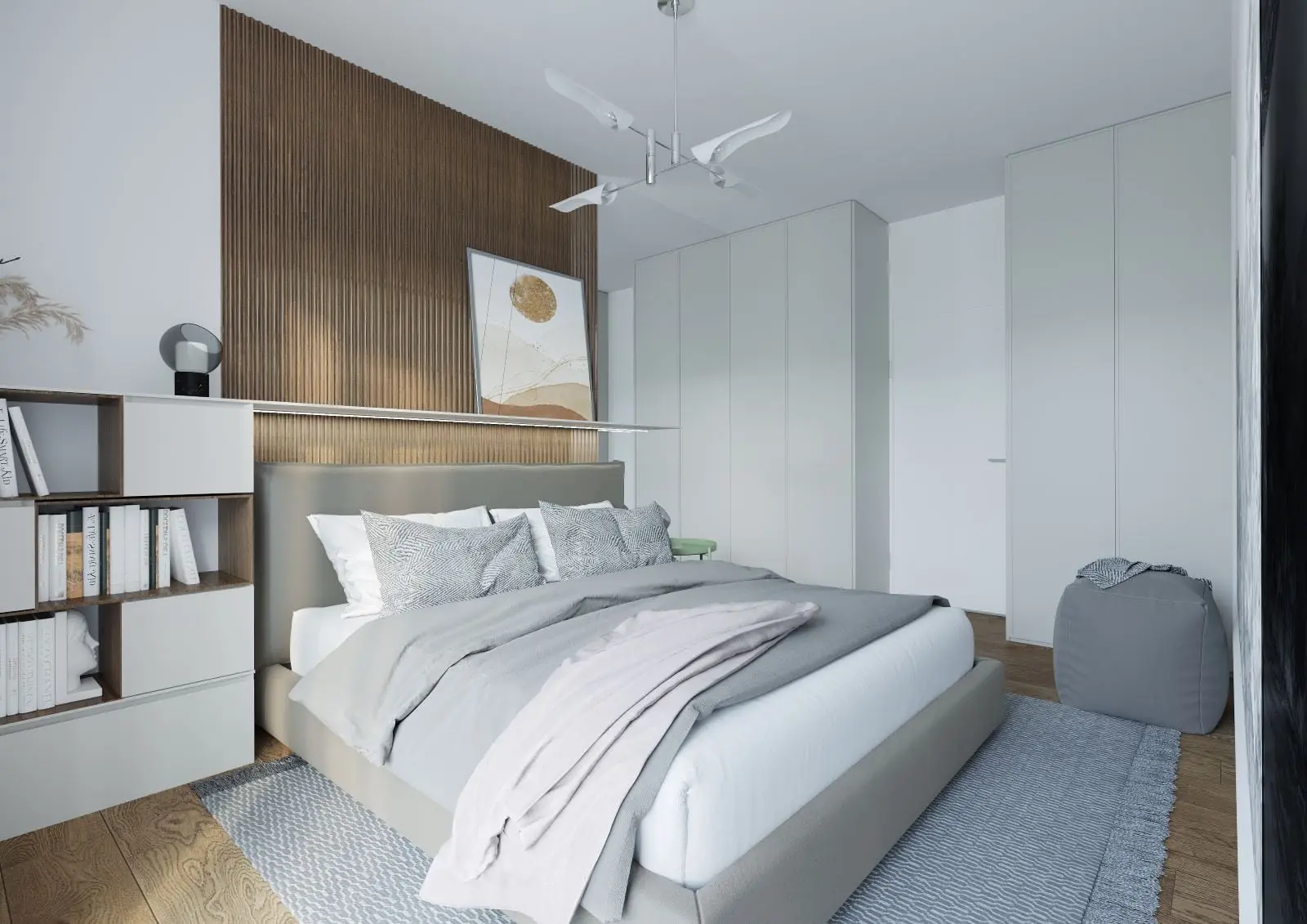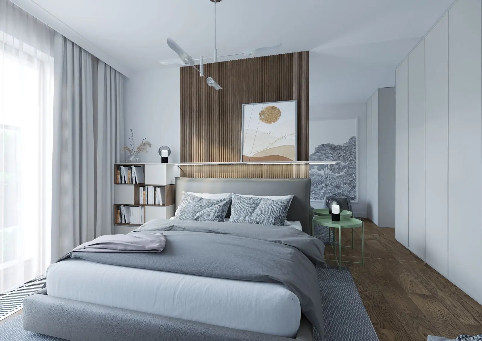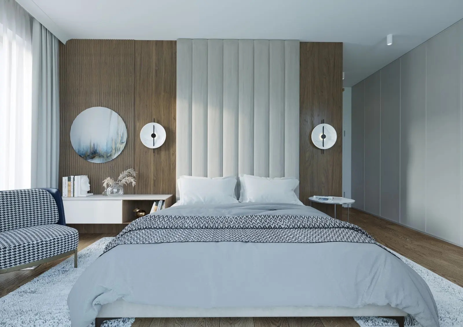 Druga część mieszkania to 70 metrów, które zostało podzielone na dwie sypialnie gościnne oraz sypialnię masters z niewielką łazienką. Duże wygodne łóżko jest tu centralnym punktem wnętrza. Natomiast ściana za łóżkiem została wykończona miękkimi panelami tapicerowanymi, które z drewnianą ścianą z lameli tworzą ciekawą harmonijną kompozycję. W strefie wypoczynkowej znajduję się również fotel, gdzie można relaksować się i czytać.