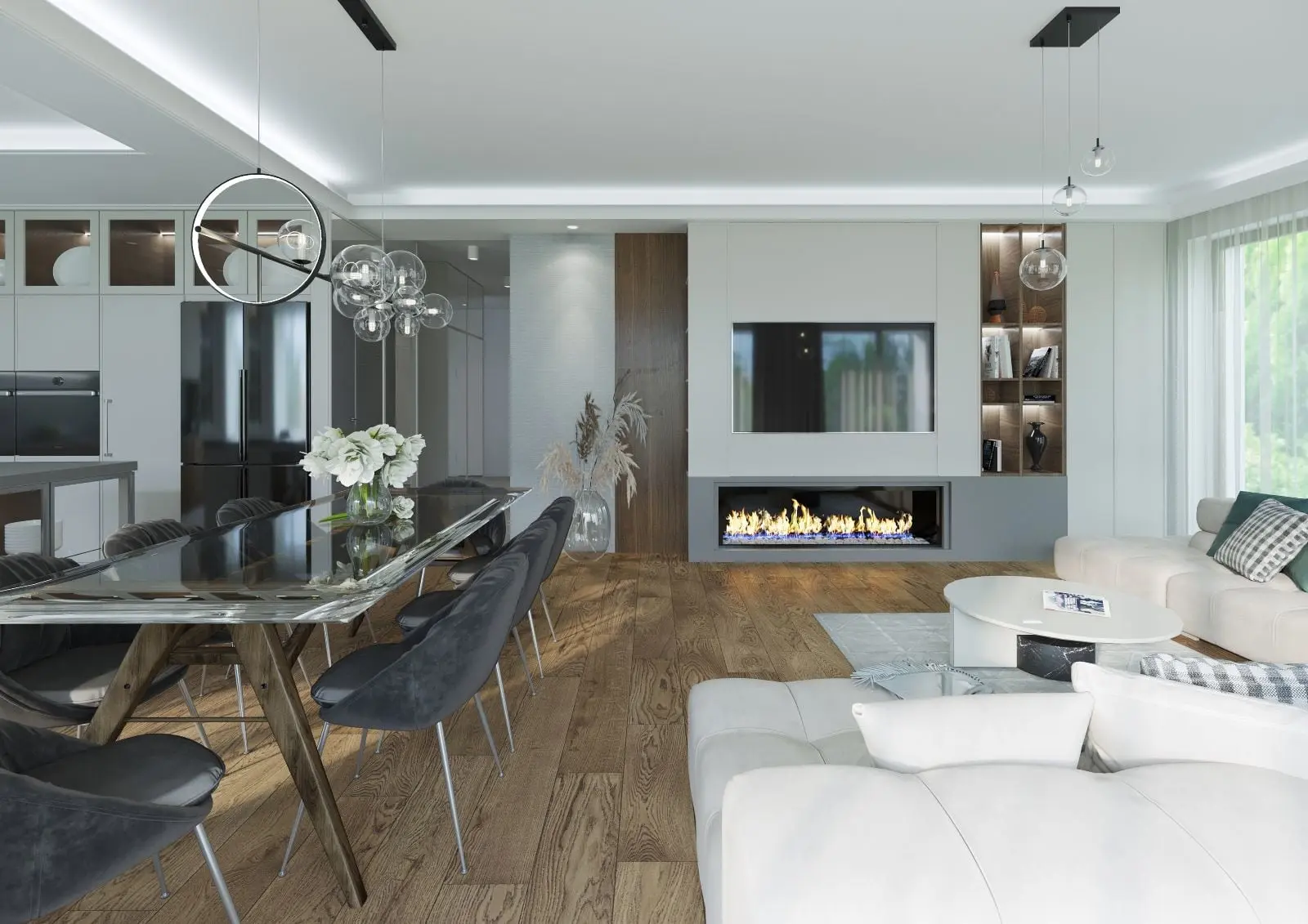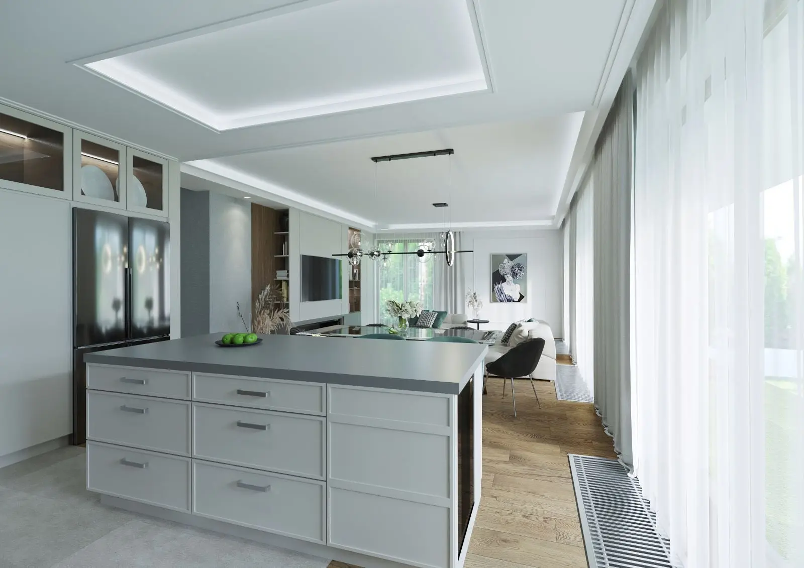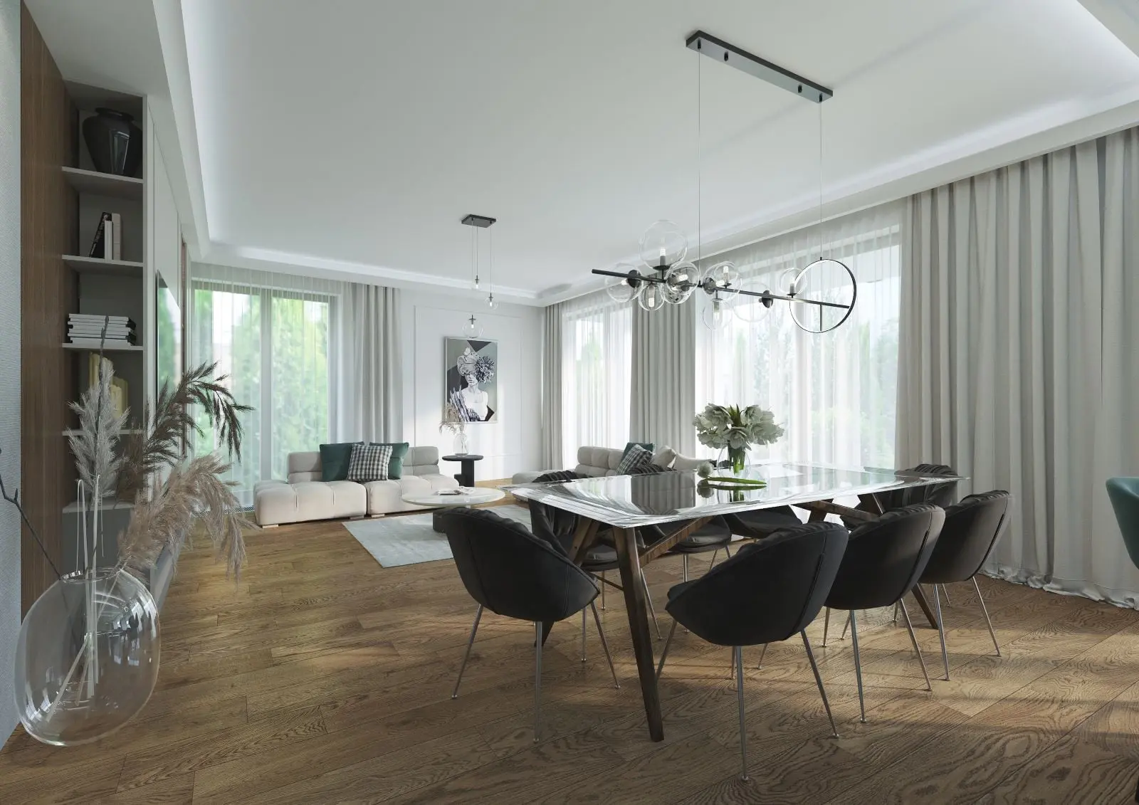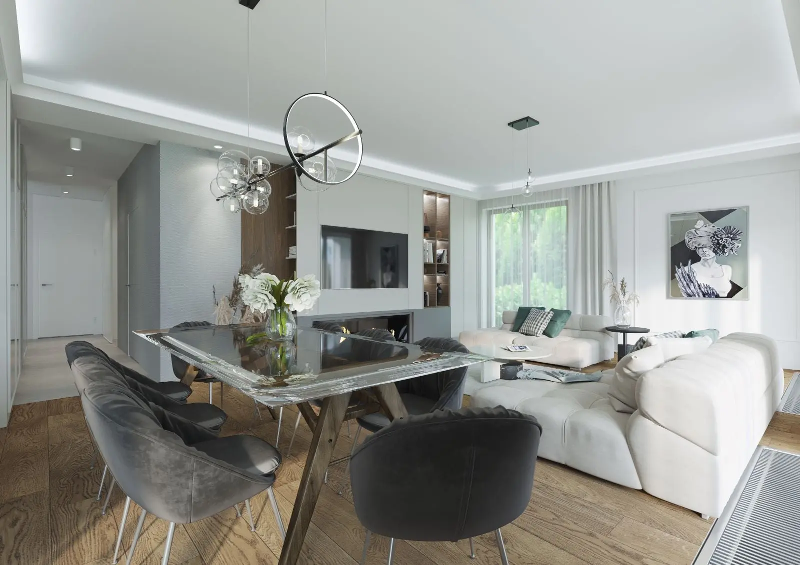 W tej przestrzeni można zobaczyć elementy nowoczesne, takie jak proste, geometryczne kształty mebli oraz minimalistyczne dodatki. Jednakże, te nowoczesne elementy są harmonijnie zintegrowane z klasycznymi detalami, takimi jak ozdobne detale na meblach, subtelne zdobienia czy wykwintne oświetlenie. Wnętrze jest jasne i przestronne, wykorzystujące światło naturalne w maksymalny sposób. Duże okna pozwalają na dostęp do obfitej ilości światła, które odbija się od jasnych powierzchni, tworząc wrażenie jeszcze większej przestrzeni. Całość jest urządzona w sposób minimalistyczny, gdzie przestrzeń i funkcjonalność są kluczowymi elementami projektu. Ograniczenie ilości dekoracji pozwala na skupienie się na głównych elementach wystroju, podkreślając ich piękno i unikalność.