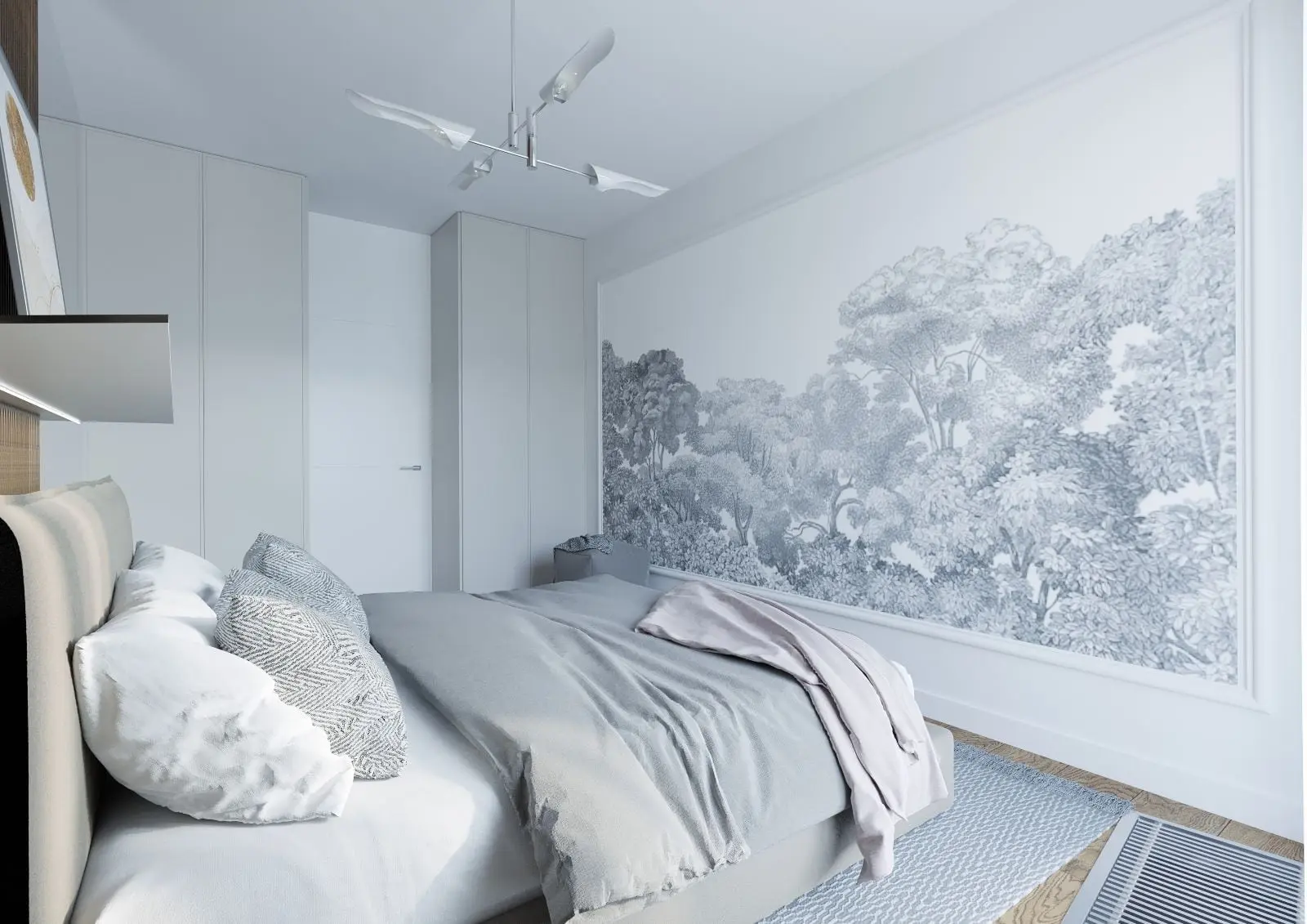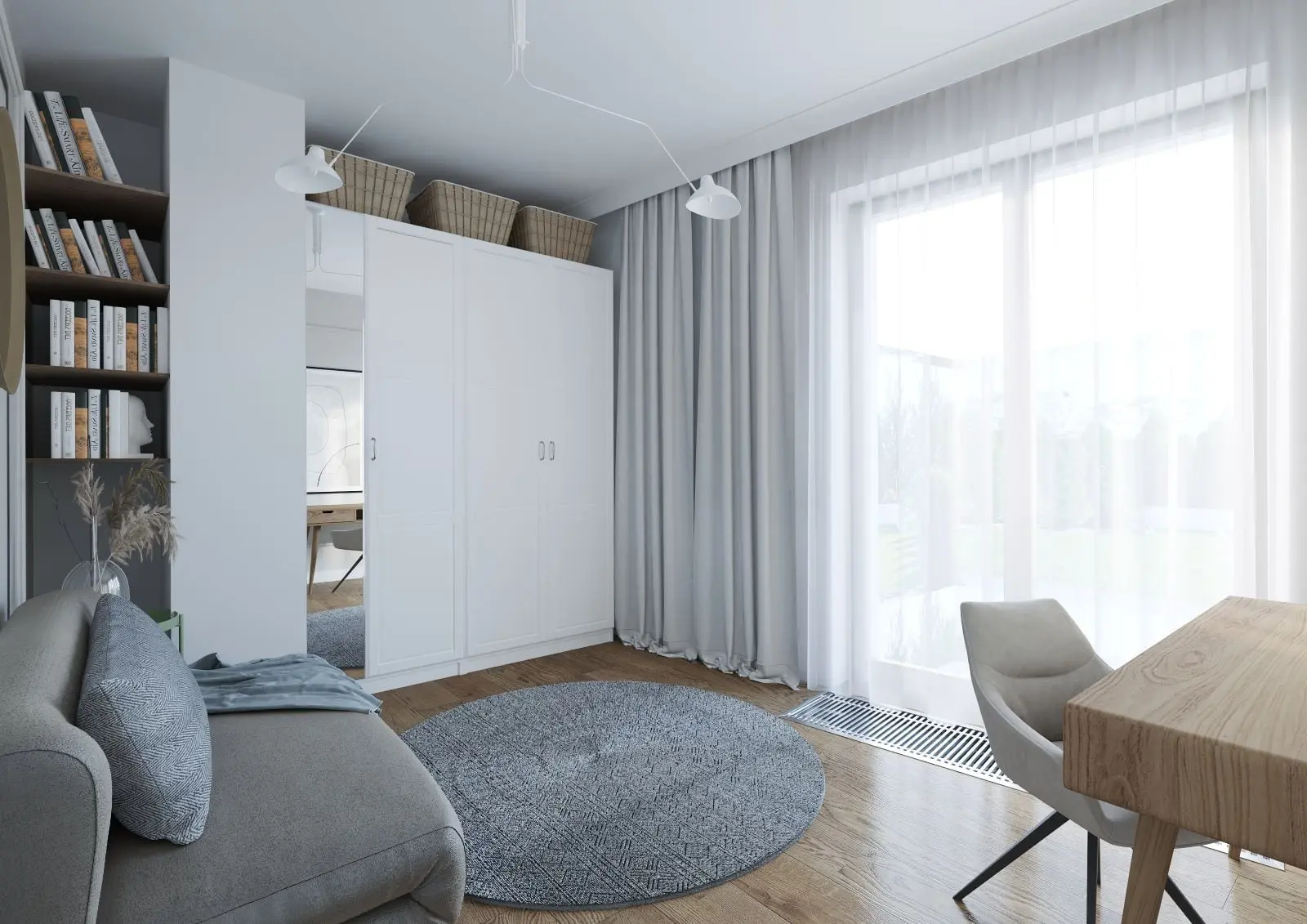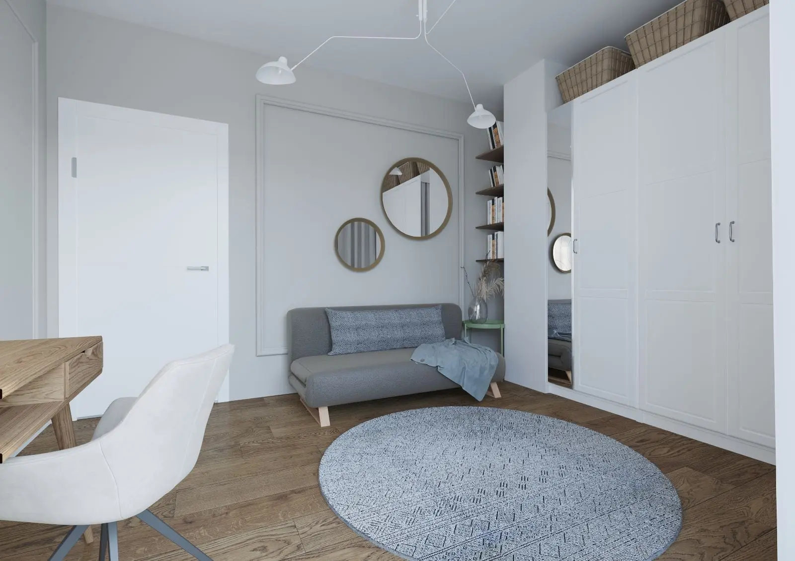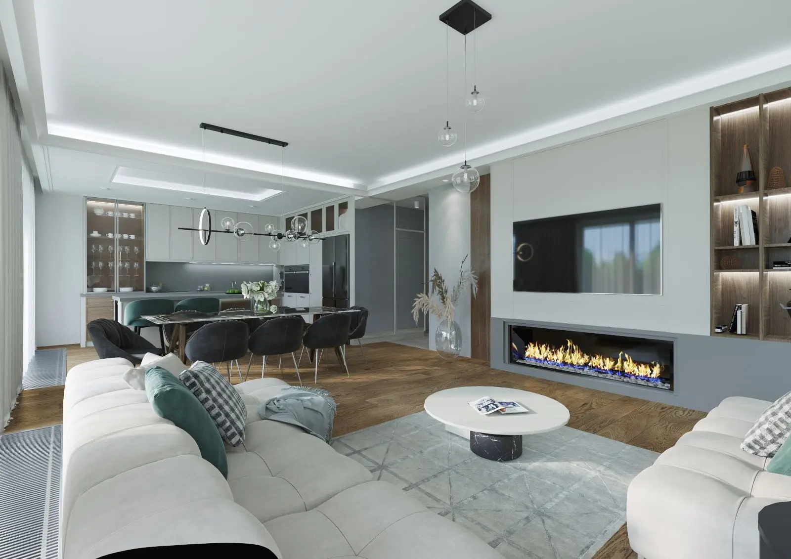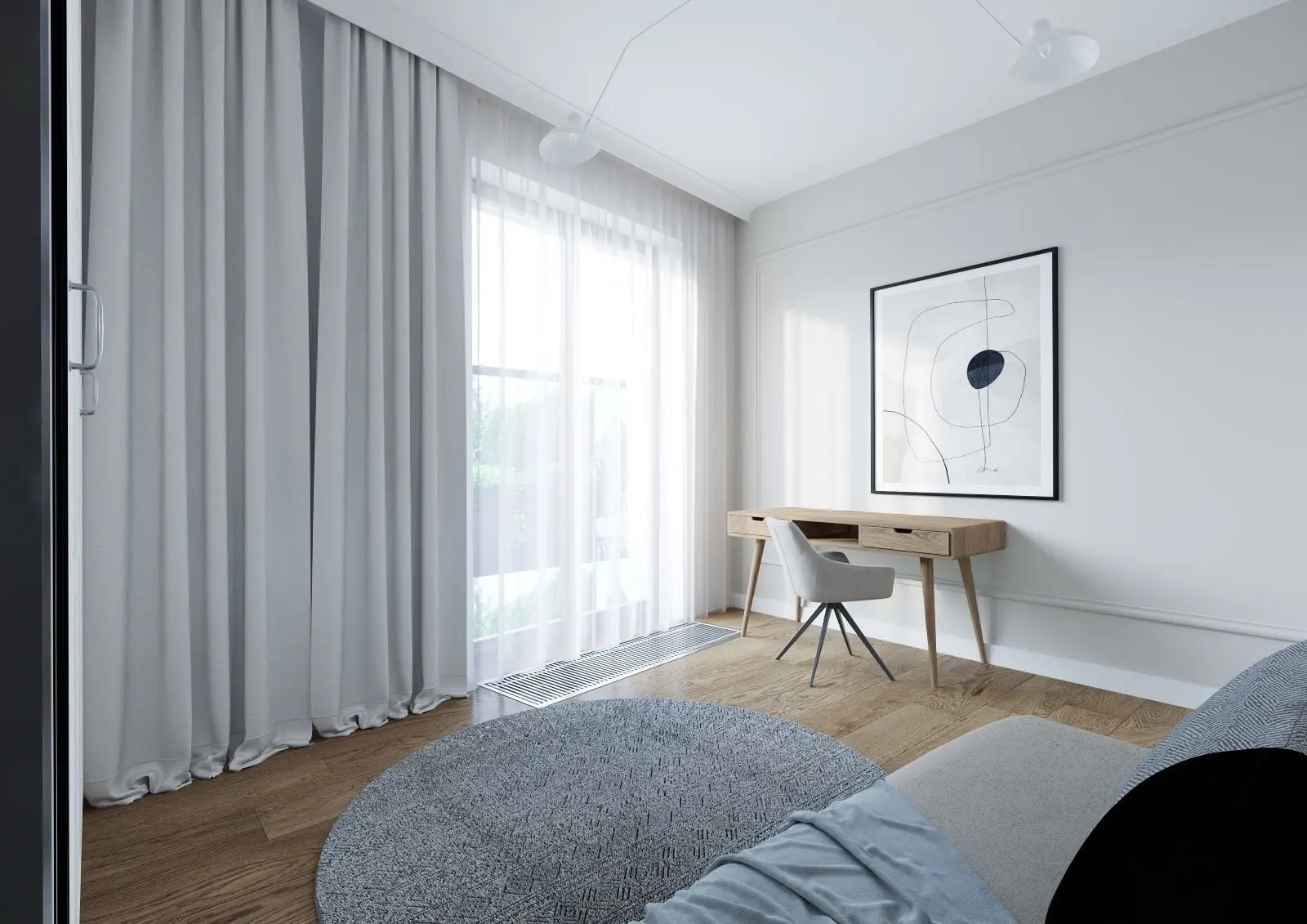 W tej przestrzeni można zobaczyć elementy nowoczesne, takie jak proste, geometryczne kształty mebli oraz minimalistyczne dodatki. Jednakże, te nowoczesne elementy są harmonijnie zintegrowane z klasycznymi detalami, takimi jak ozdobne detale na meblach, subtelne zdobienia czy wykwintne oświetlenie. Wnętrze jest jasne i przestronne, wykorzystujące światło naturalne w maksymalny sposób. Duże okna pozwalają na dostęp do obfitej ilości światła, które odbija się od jasnych powierzchni, tworząc wrażenie jeszcze większej przestrzeni. Całość jest urządzona w sposób minimalistyczny, gdzie przestrzeń i funkcjonalność są kluczowymi elementami projektu. Ograniczenie ilości dekoracji pozwala na skupienie się na głównych elementach wystroju, podkreślając ich piękno i unikalność.
