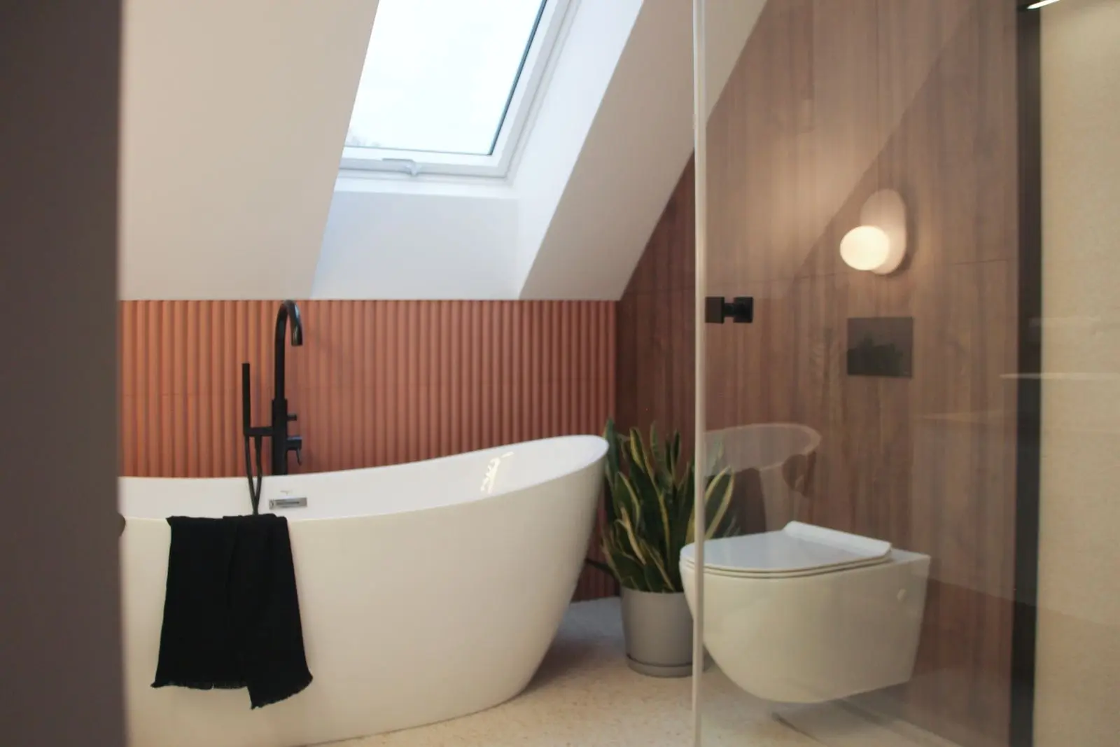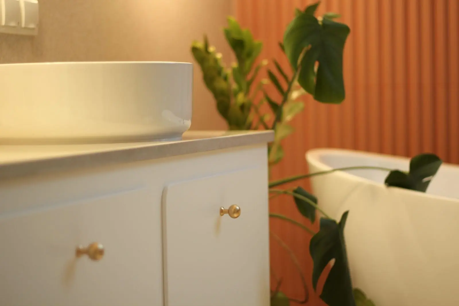Kolory zastosowane we wnętrzu to tzn. „paleta ziemi”- od delikatnych beży, bieli, przez brązy fornirów i drewnianej podłogi, aż po dość mocne pomarańcze użyte głownie w postaci płytek Wow Design, tapety firmy Arte, Selva i dodatków. Nie zabrakło tu także złotych, dodających eleganckiego wykończenia elementów, takich jak lampy czy uchwyty meblowe. We wnętrzu możemy dostrzec spajający całość i nadający rytm motyw, jakim jest ryflowanie we frontach mebli oraz użytym szkle. Zabieg ten, przy pomocy światłocienia dodaje płaszczyznom, a tym samem reszcie przestrzeni, subtelnego dynamizmu.