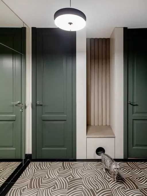 Strefę wejścia zdobią płytki cementowe End Grain Ocean włoskiej marki Bisazza, której produkty są dostępne w showroomach Internity Home. W takim towarzystwie nawet trudna do zaprojektowania kuweta dla kota wygląda estetycznie. Architektki znalazły na nią miejsce pod tapicerowanym siedziskiem, które jest bardzo przydatne w projekcie przedpokoju chociażby do wygodnego zakładania obuwia.
