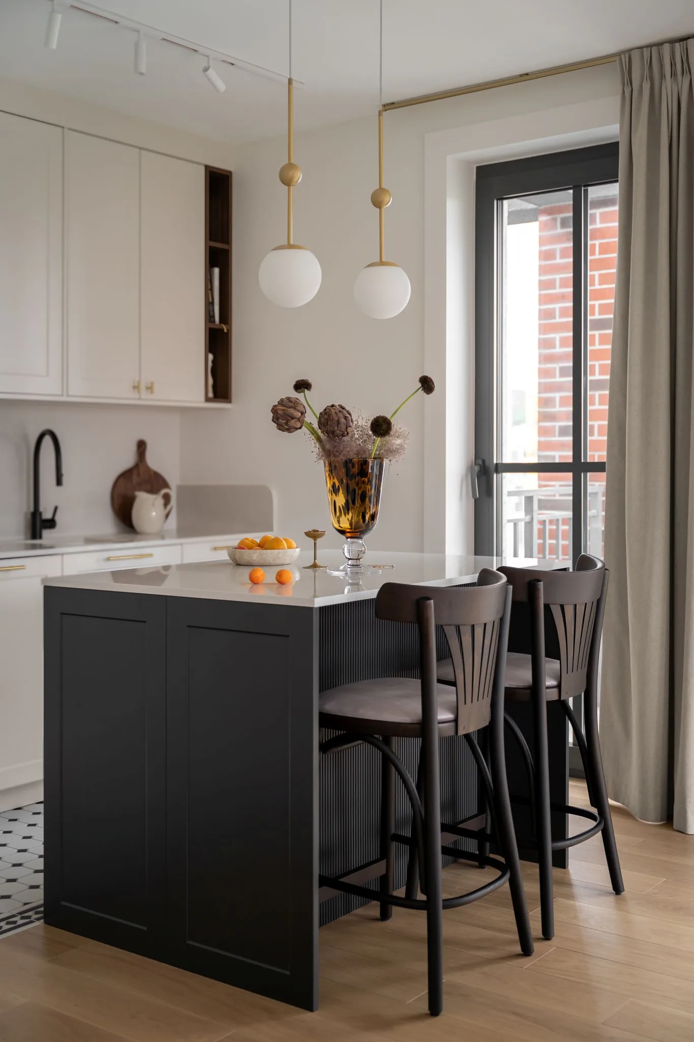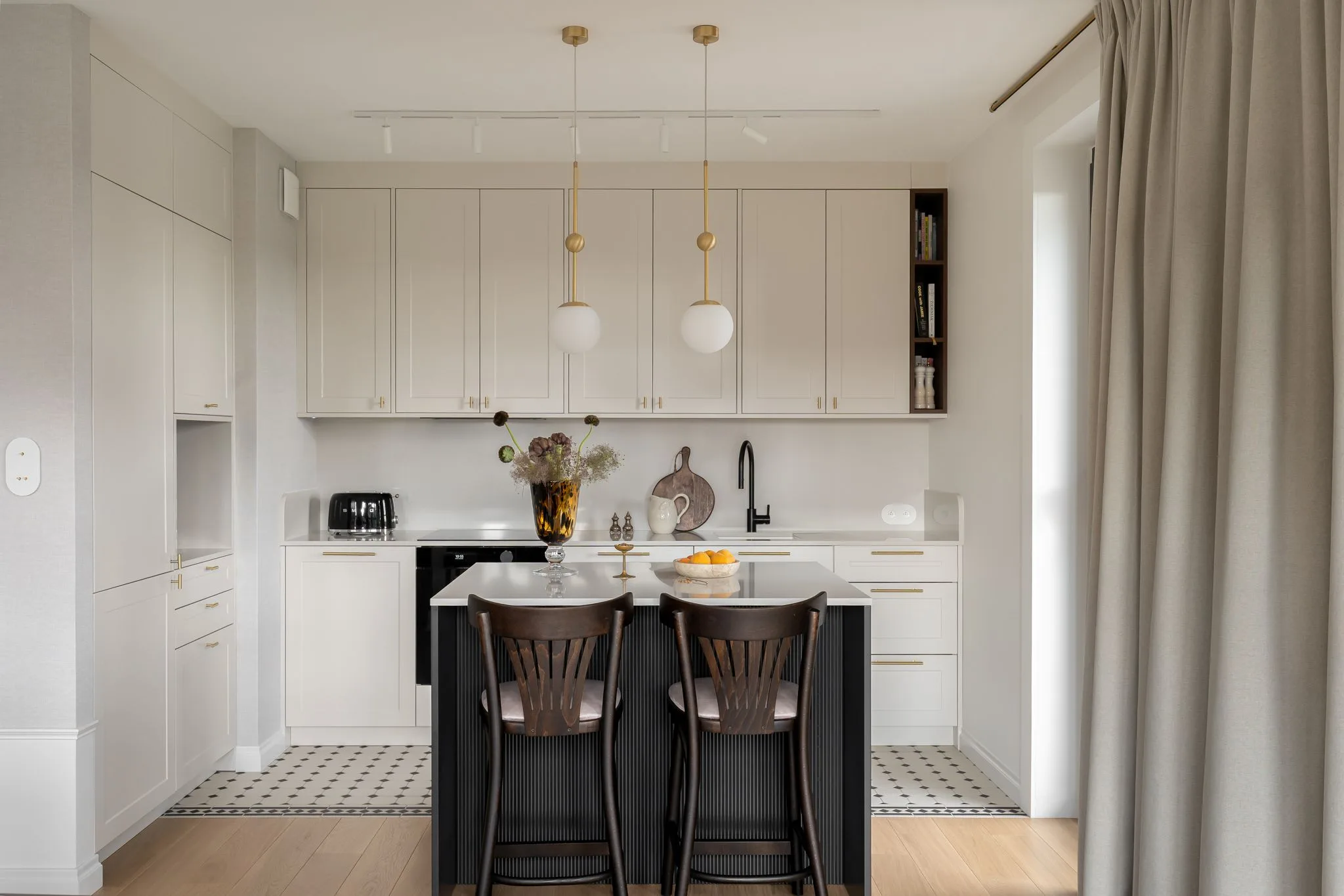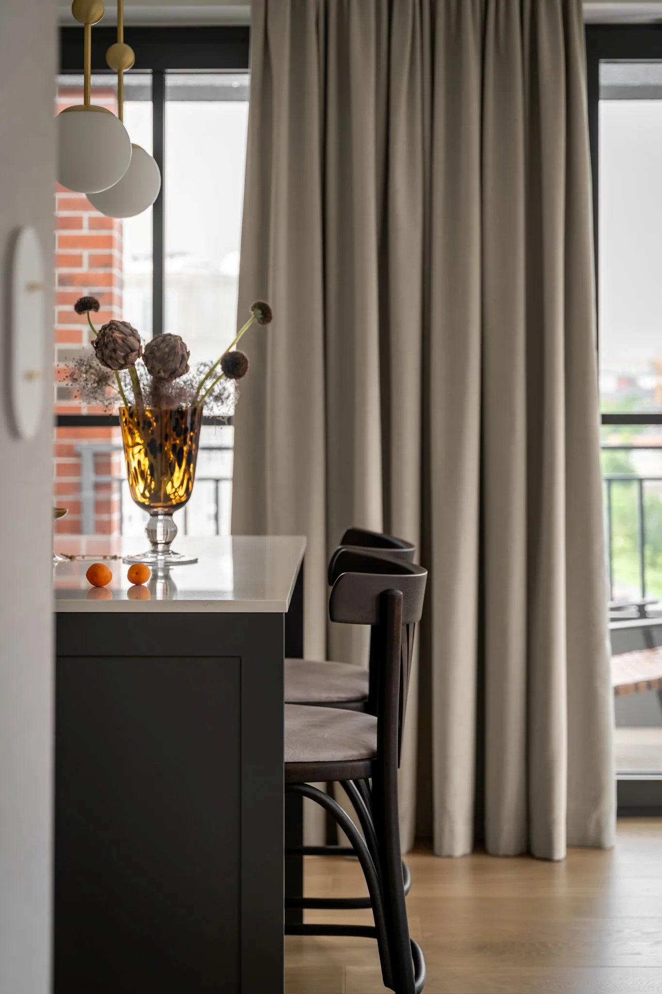 Projekt jest również hołdem dla polskiego wzornictwa. Starannie dobrane meble, w tym sofa i krzesła od IWC Home, stół od Tabell oraz hokery od Fameg, nie tylko urzekają designem, ale zapewniają najwyższy komfort użytkowania. Stylizację apartamentu dopełniła subtelna ręka Justyny Sobieckiej z Dekoruje Kadry, nadając przestrzeni finalnego, harmonijnego szlifu.