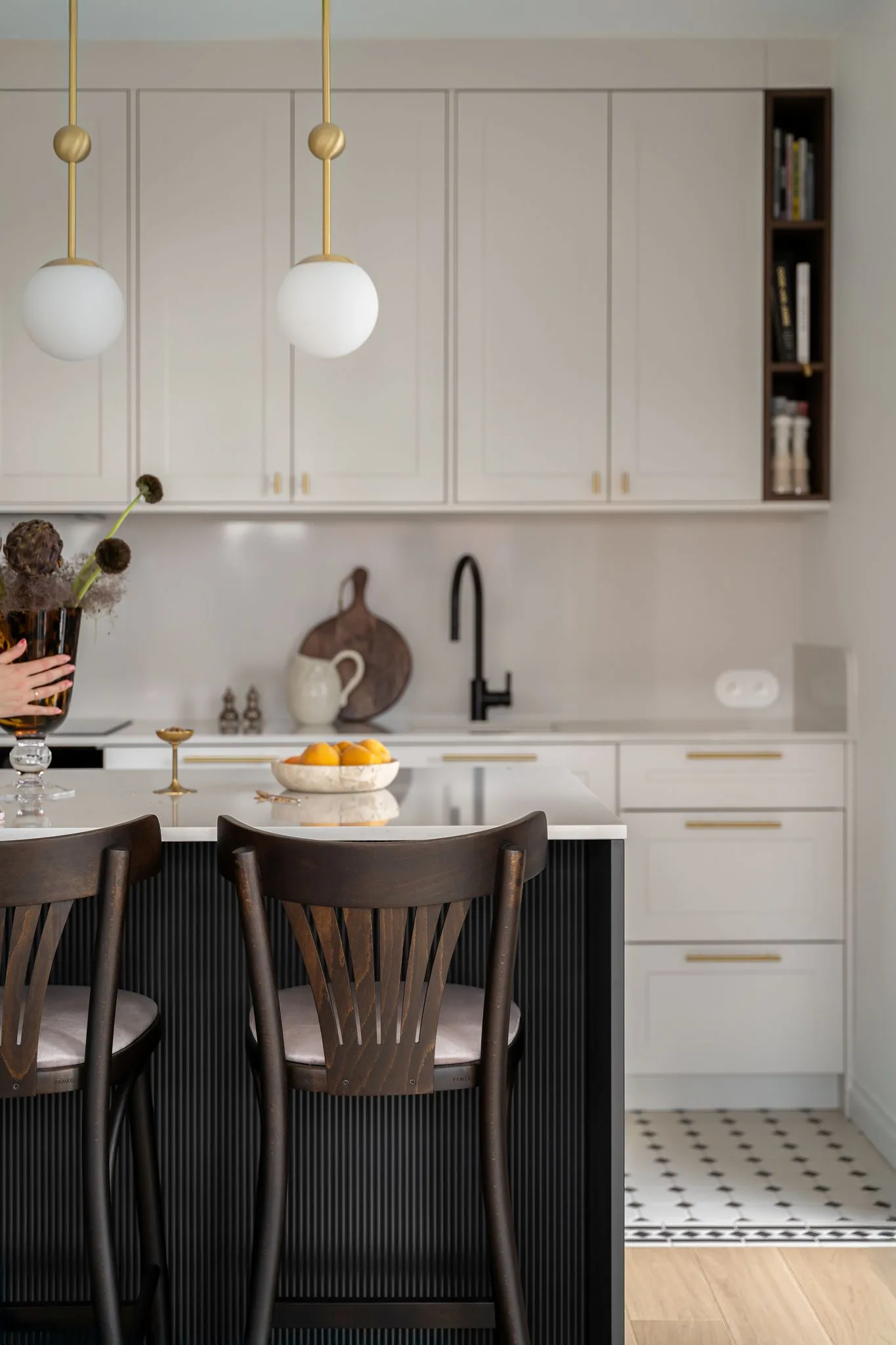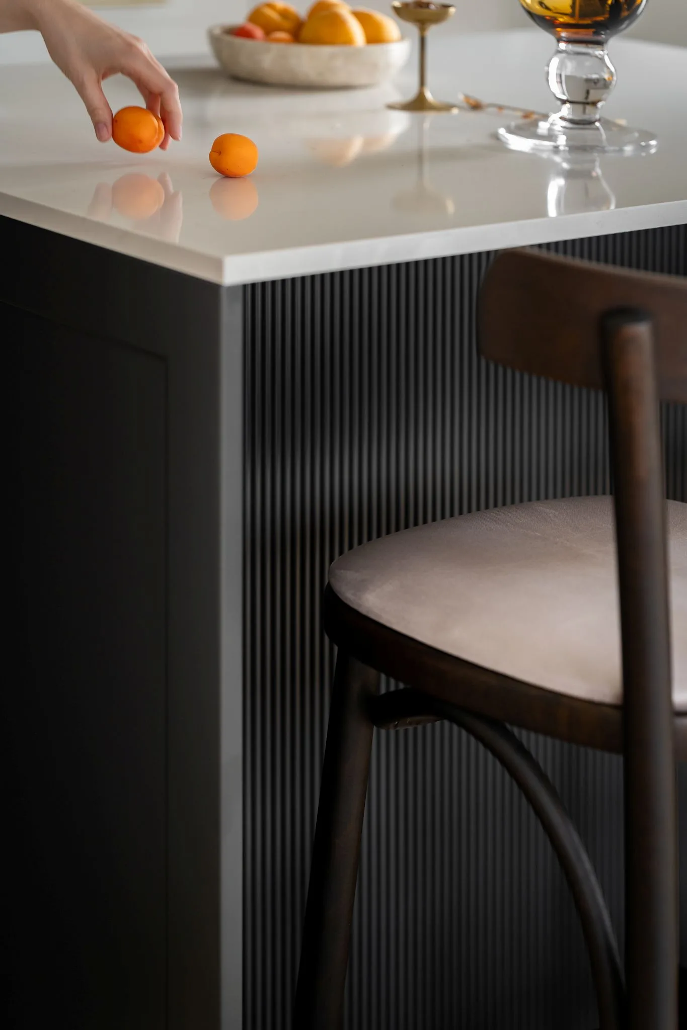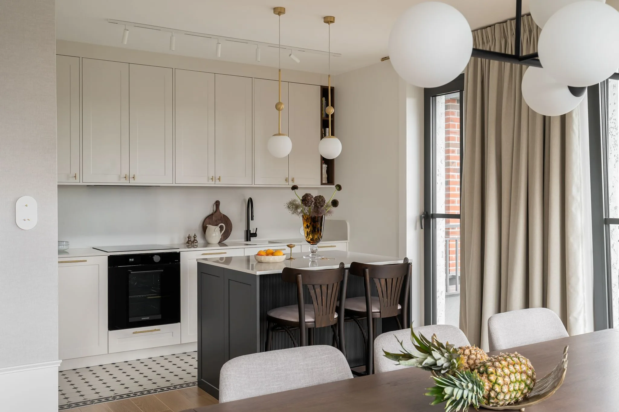 Projekt jest również hołdem dla polskiego wzornictwa. Starannie dobrane meble, w tym sofa i krzesła od IWC Home, stół od Tabell oraz hokery od Fameg, nie tylko urzekają designem, ale zapewniają najwyższy komfort użytkowania. Stylizację apartamentu dopełniła subtelna ręka Justyny Sobieckiej z Dekoruje Kadry, nadając przestrzeni finalnego, harmonijnego szlifu.