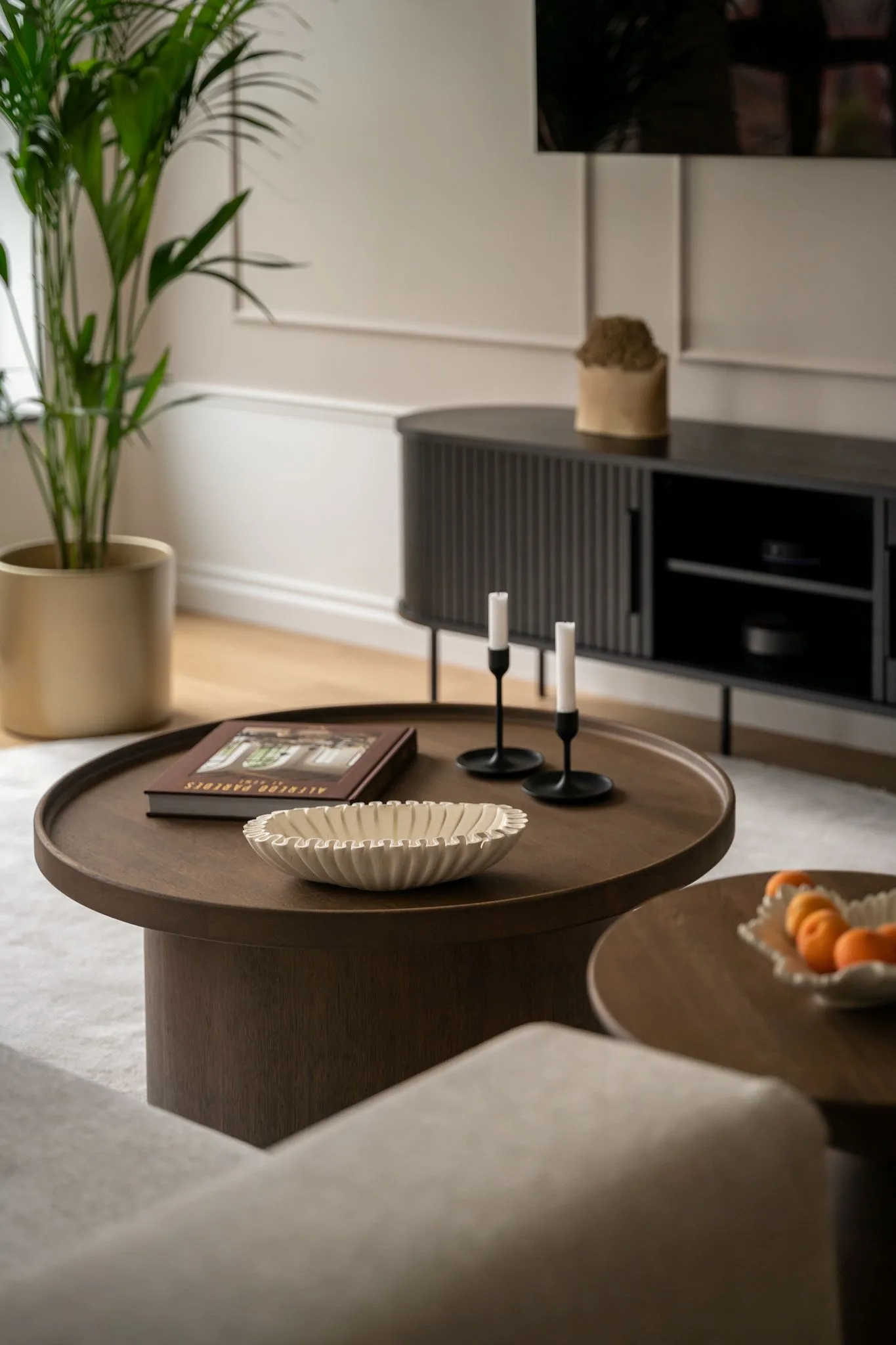 Od pierwszych kroków w tym mieszkaniu uwagę przyciąga ciepło naturalnych odcieni. Dębowa podłoga, fornirowane i lakierowane meble, a także kontrastujące z nimi czarno-białe mozaiki, stanowią esencję elegancji. Nie brakuje tu jednak wyrazistych akcentów – czerń i złoto nadają wnętrzu głębi, charakteru oraz szykownego błysku. Delikatne akcenty błękitu i granatu wprowadzają subtelną świeżość, będąc doskonałym uzupełnieniem tej kompozycji.