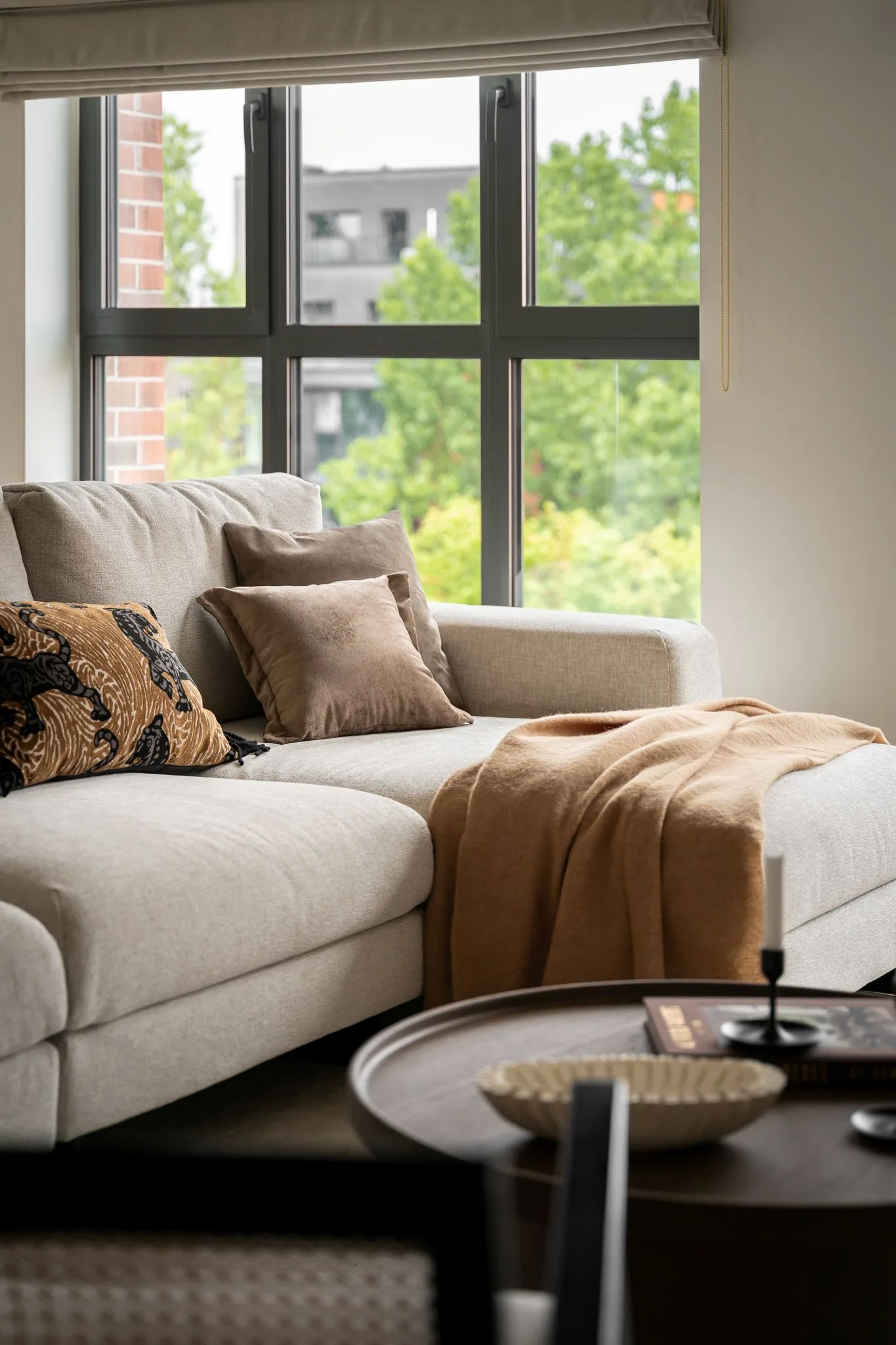 Salon, dzięki dużym, antracytowym oknom ze szprosami, przypomina nowojorskie apartamenty, oferując panoramiczny widok na Gdańsk i zapewniając mieszkańcom poczucie wyjątkowej intymności. To właśnie tu estetyka spotyka się z praktycznością, a elegancki minimalizm podkreśla charakter przestrzeni.