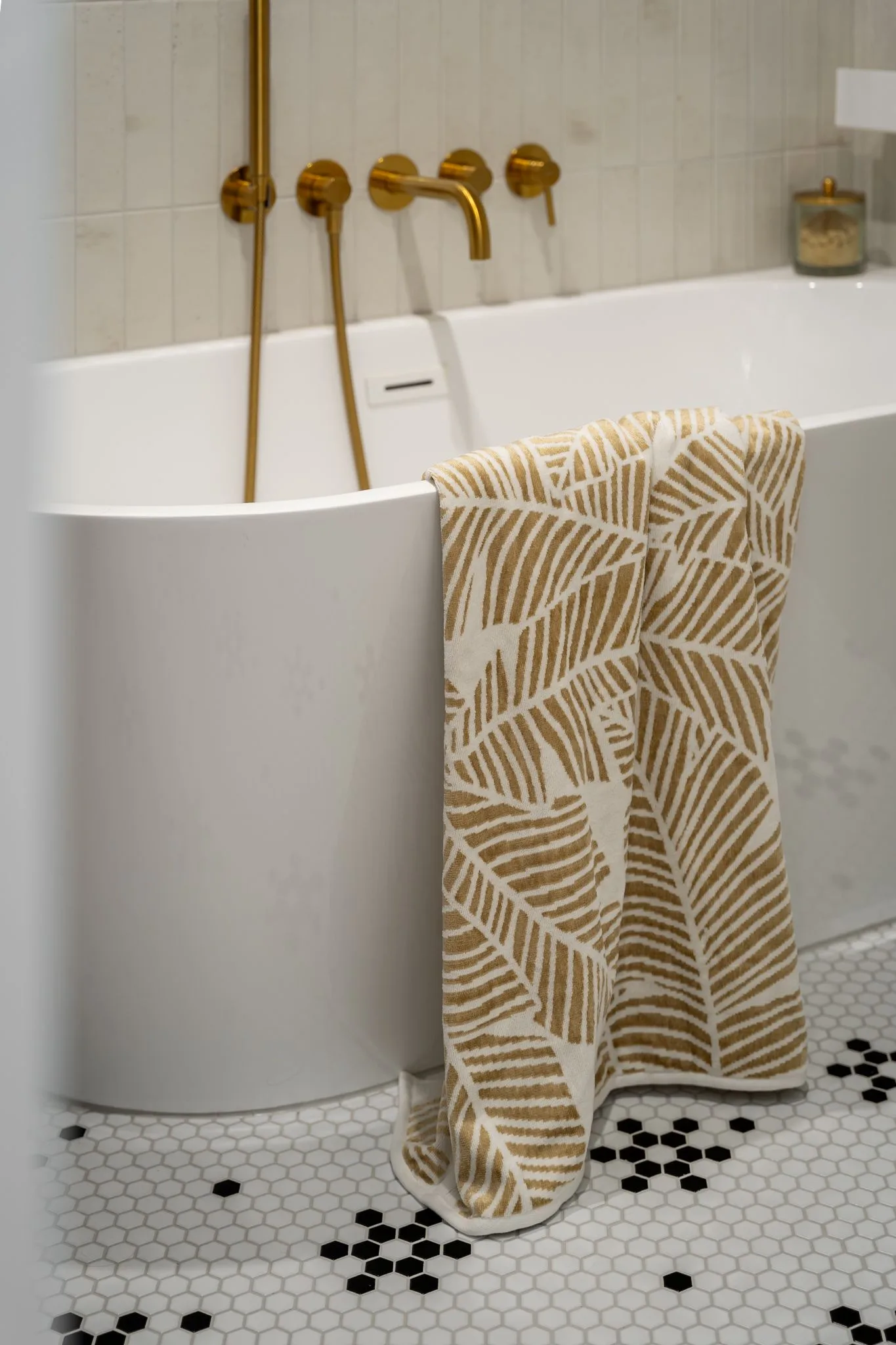 W łazienkach i przedpokoju uwagę przyciąga geometryczna mozaika – ponadczasowa klasyka w nowoczesnej formie. Drewniane fronty mebli równoważą chłód błyszczących płytek ściennych, a złote akcenty armatury nadają tej przestrzeni nutę subtelnego luksusu.