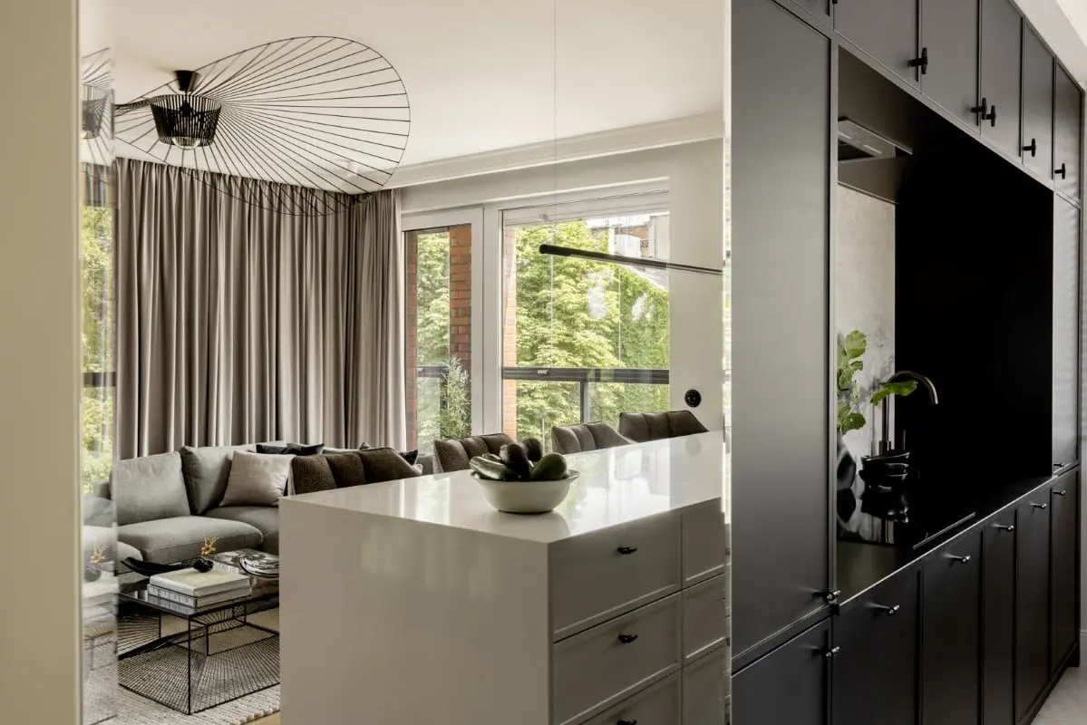 Dopełnieniem tak wymyślonej przestrzeni jest wyselekcjonowane, wysokiej jakości wyposażenie a także wzór marmuru, który pojawia się w formie spieków. Szlachetny kamień z mocnym żyłowaniem, nie tylko wprowadza aurę luksusu, ale również stanowi pomost pomiędzy kontrastowym zestawieniem czerni i bieli. Dobrze to widać szczególnie w projekcie minimalistycznej, aczkolwiek bardzo efektownej kuchni.