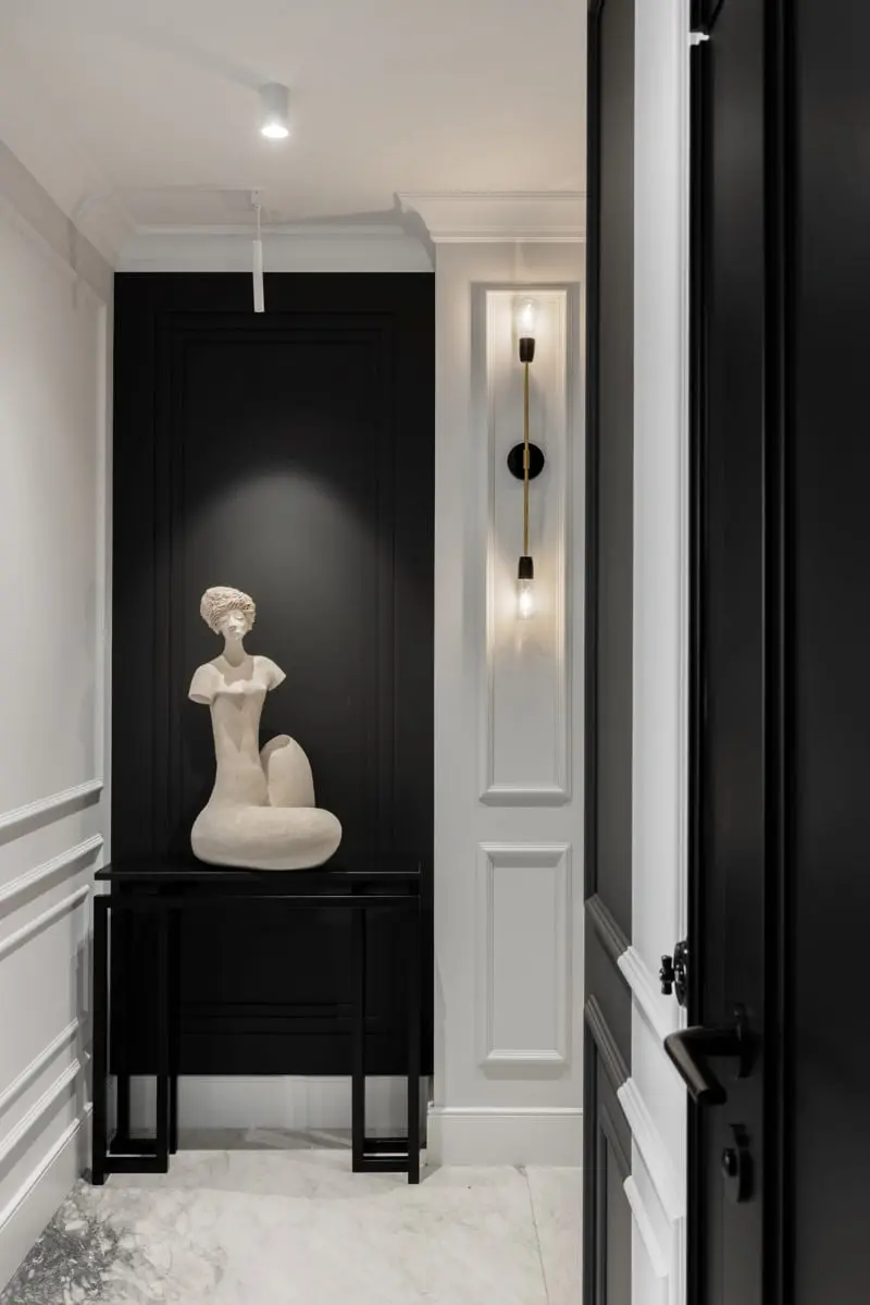 Strefa wejścia to wspaniała zapowiedź tego, czego możemy się spodziewać po całym apartamencie. Monochromatyczne wnętrze, niepozbawione jednak fantazji, dopieszczone sztuką i detalami, które razem tworzą piękną całość – tak w skrócie moglibyśmy opisać zarówno każde pojedyncze pomieszczenie, jak i cały projekt. Zamiłowanie do klasyki podkreśla rzeźba stworzona przez Alicję Przydrygę. Jej piękno uwypukla odpowiednio dobrana oprawa ze światłem skierowanym w dół.