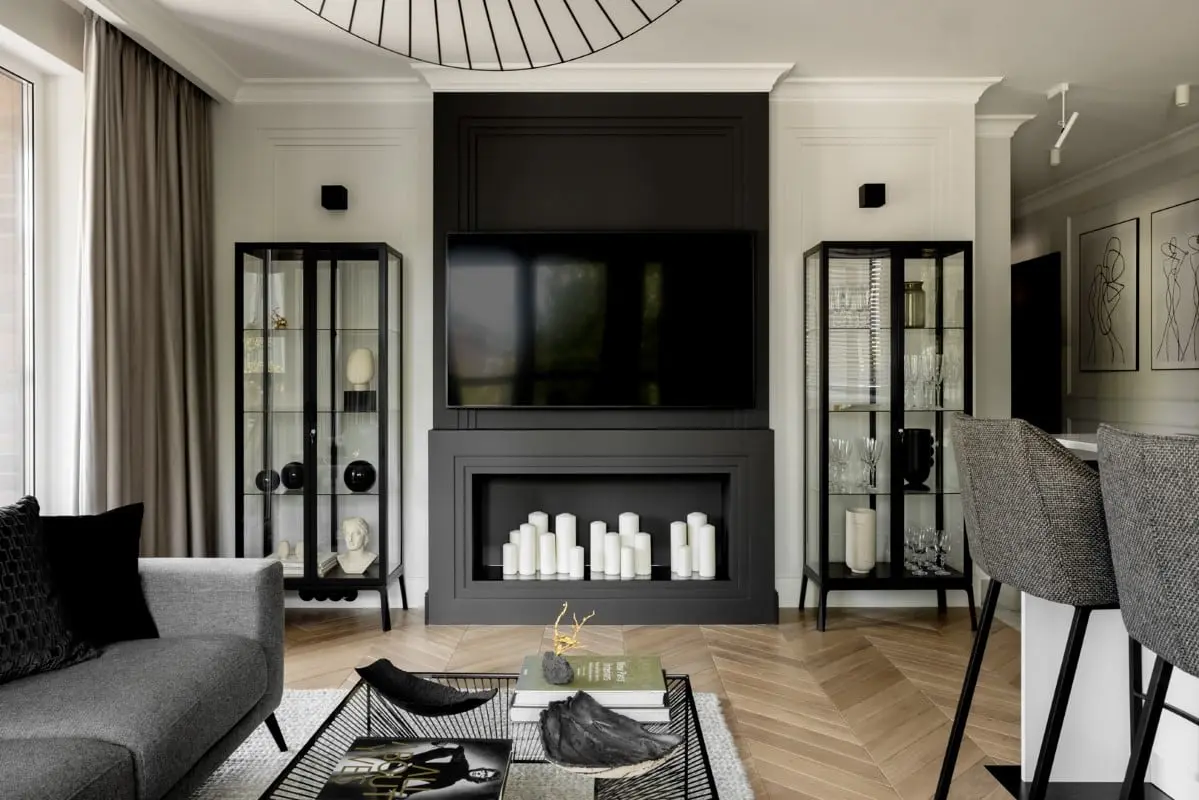 Sercem salonu jest okazały narożnik w kształcie litery L. Jednak kluczową częścią aranżacji jest ściana telewizyjna. Tutaj, czarno na białym widać zamysł i konsekwencję w realizacji tego konceptu oraz umiłowanie klasyki, w której prym wiedzie nieśmiertelna triada: ład, harmonia i prostota.