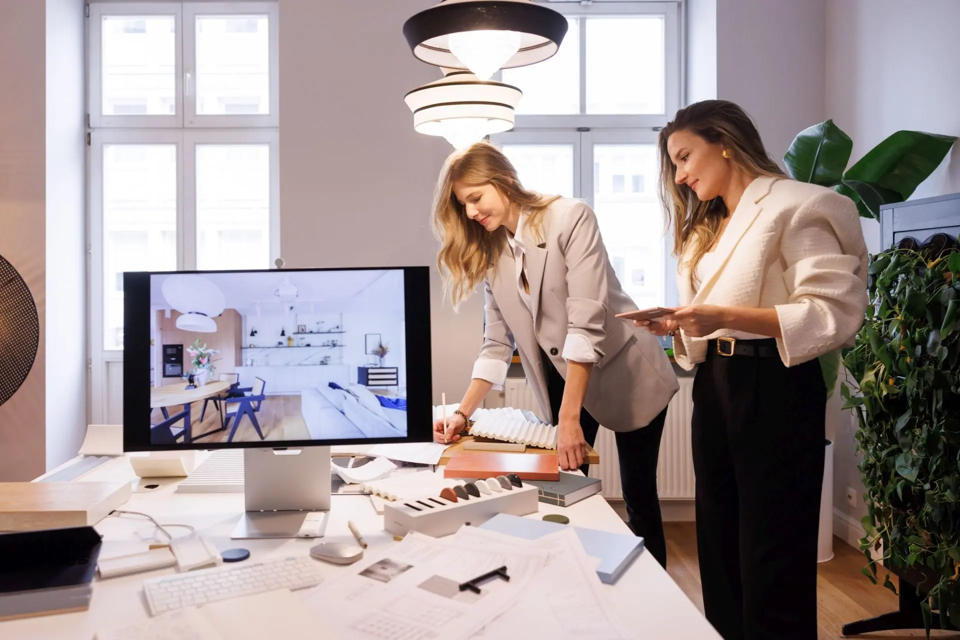 Dla nas jakość wizualizacji to bardzo istotny element projektu. Staramy się, aby te prezentacje sprawiały radość inwestorom. Zdajmy sobie sprawę, że niewiele osób ma wyobraźnię przestrzenną, zatem obrazki projektów muszą jak najbardziej przypominać rzeczywistość. Klient nie zawsze potrafi wyobrazić sobie choćby konkretny zestaw dodatków, a często dopełnienie wizualizacji w drobne dekoracje sprawia, że całość jest spójna. Programy, na których tworzymy to Sketch up + Vray oraz Photoshop. Od niedawna pracujemy na monitorze Samsung ViewFinity Ss9, który ma rozdzielczość 5k, w ten sposób mamy większy obszar roboczy na ekranie. To bardzo ułatwia ocenę całego projektu, ponieważ możemy mieć jednocześnie otwarte dwa duże okna koncepcji. Funkcja Pivot (obrócenie monitora do pionowej pozycji) daje nam możliwość oceny pionowego kadru w dużym rozmiarze. Dodatkowo ten ekran posiada certyfikat Pantone, który gwarantuje idealne odwzorowanie koloru. To bardzo ważne! Miałyśmy raz problem w tym zakresie pracując na innych ekranach. Każda z nas odczytywała kolor zupełnie inaczej na dwóch monitorach, a wzornik kolorów na żywo pokazywał jeszcze coś innego. Szukałyśmy rozwiązania, który pogodzi nam te trzy różne środowiska i odpowiedzią był właśnie ViewFinity S9.