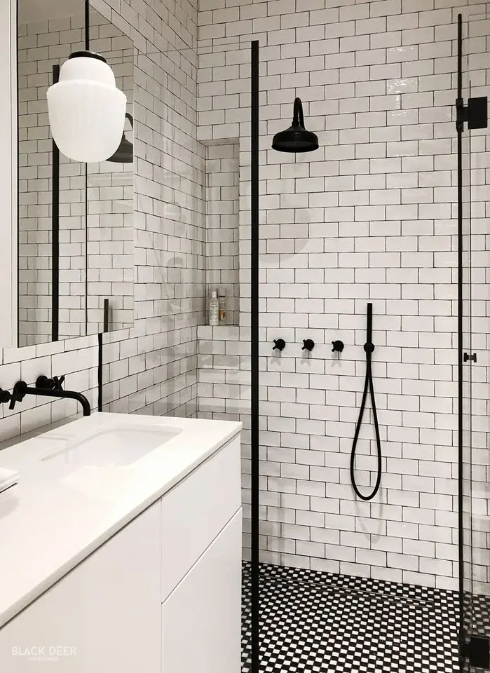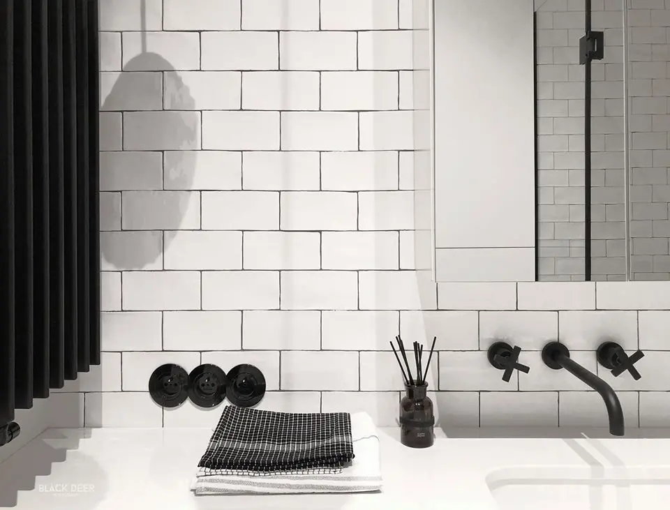 Łazienka urządzona w minimalistyczny stylu lecz z oryginalnym lookiem. Białe pofalowane płytki tworzą z czarną armaturą ciekawe nawiązanie do surowego stylu loftowego.