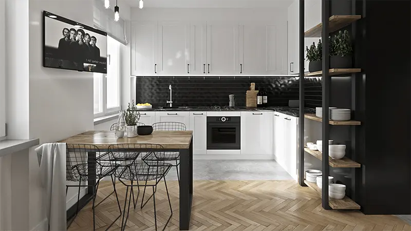W mieszkaniu zostało przebudowanych kilka ścian działowych, dzięki temu powstała funkcjonalna strefa dzienna z salonem, kuchnią, jadalnią i przedpokojem. Biała kolorystyka szafek kuchennych cudownie kontrastuje z czarnymi płytkami i resztą wnętrza trochę industrialnego. Styl wnętrza został podkreślony ciekawymi motywami dekoracyjnymi jak również oświetleniem. Przytulne i stylowe wnętrze, w którym zamieszkalibyśmy od razu.