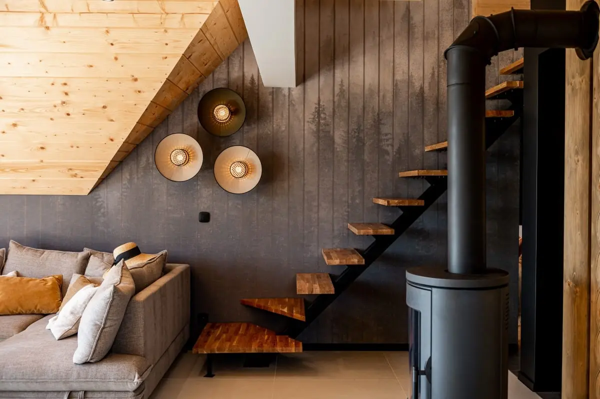 W domku znajduje się antresola, na którą prowadzą minimalistyczne schody. Dzięki przemyślanemu projektowi nie zajmują dużo miejsca oraz doskonale wpisują się w estetykę wnętrza. Naturalny klimat podkreśla zastosowana tapeta. Las za mgłą idealnie zdaje egzamin w pomieszczeniu stworzonym do wypoczynku. Całość dopełniają kinkiety od Market Set.