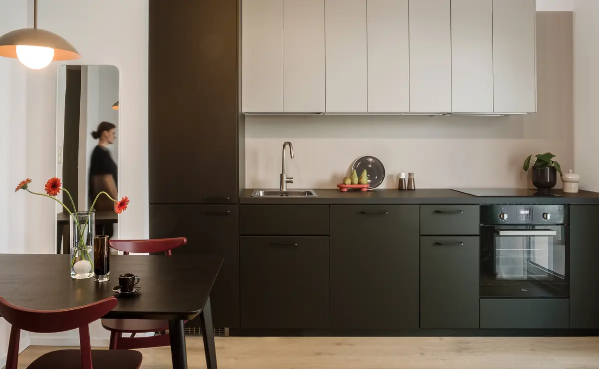 Choć czarna kuchnia w niewielkim mieszkaniu nie jest typowym wyborem, to stanowi interesujący akcent, który nadaje charakter otwartej przestrzeni.