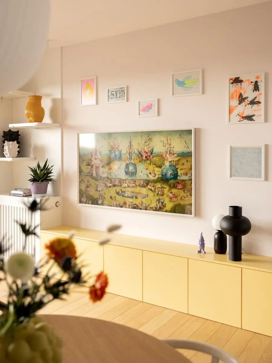 Drewniany rozkładany stół oddziela aneks od części dziennej. Tu główną rolę gra biało – żółty regał z miejscem na książki i kolorowe dodatki. W zabudowie pod półkami ukryte jest też kocie legowisko. Na tle regału stanęła ciemno-beżowa kanapa i stolik kawowy w eleganckim czerwonym odcieniu. Po przeciwnej stronie stanęła zabudowa rtv w słonecznym żółtym kolorze. Od strony korytarza jest zwieńczona łukiem, charakterystycznym detalem pojawiającym się we wszystkich pomieszczeniach. Obok telewizora mieści się również zabudowa grzejnika i dodatkowe półki. Warto wspomnieć, że znajdujące się w mieszkaniu grafiki i plakaty, które Inwestorzy starannie wyselekcjonowali, miały niemały wpływ na charakter wnętrza i zastosowaną w nim kolorystykę. Całość wzajemnie się uzupełnia.