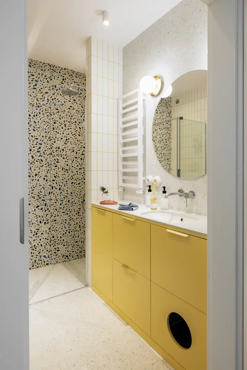 Aranżacja przedpokoju konsekwentnie powtarza środki wyrazu zastosowane w części dziennej. Biel ścian łączy się tu z błękitnymi lamelami. Duże lustro zakończone łukiem powiększa i rozjaśnia przestrzeń. Drzwi prowadzą do niewielkiej łazienki. To pomieszczenie wymagało szczególnej uwagi, gdyż każdy centymetr był na wagę złota. Dzięki wydzieleniu prysznica nowo wybudowanymi ściankami i drobnym zmianom w pierwotnym układzie dewelopera na niedużym metrażu udało się zaplanować wszystko, czego potrzebowali Właściciele. Pojemna zabudowa umywalki mieści wszystkie przybory i kosmetyki, znalazło się tu też miejsce na przechowywanie rzeczy do prania oraz wysuwaną szufladę z kocią kuwetą. Ponadto łazienka posiada dużą strefę prysznicową oraz ukrytą w zabudowie naprzeciwko umywalki pralkę. Dzięki wyważeniu proporcji jasnych i kolorowych elementów oraz odpowiedniemu doświetleniu pomieszczenia – łazienka wydaje się dużo większa niż jest w rzeczywistości. Przy tym wszystkim zastosowany dobór kolorów i materiałów czyni ją wyjątkową.
