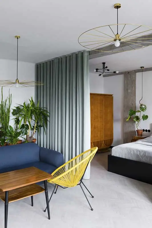 Architekci z pracowni bro.Kat zdecydowali się wyburzyć ścianę dzielącą salon i kuchnię. Dzięki temu uzyskano przestronną strefę dzienną, która optycznie powiększa mieszkanie. Właścicielce zależało, by we wnętrzu znalazło się pomieszczenie gospodarcze, mieszczące pralkę, deskę do prasowania, suszarkę oraz inne sprzęty niezbędne do utrzymania czystości w domu. Udało się je wydzielić z powierzchni kuchni i ukryć za przesuwnymi drzwiami. Kolejnym sprytnym i funkcjonalnym rozwiązaniem było usunięcie ściany dzielącej sypialnię i salon i zastąpienie jej kotarą w kolorze miętowym, która daje możliwość w szybkiego powiększenia otwartej przestrzeni. Architekci zaproponowali, także przeniesienie drzwi do łazienki na inną ścianę, aranżując w ten sposób niewielką przestrzeń w bardziej funkcjonalny sposób.