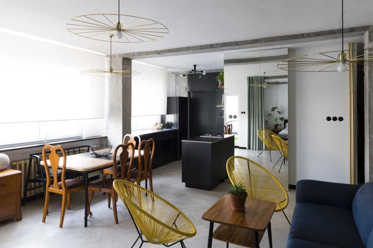 Mieszkania w blokach z wielkiej płyty stopniowo przestają kojarzyć się ze złem koniecznym i miejscami, z których się ucieka. Budownictwo z lat 50. i 60., zyskuje popularność wśród ludzi poszukujących swojego pierwszego M. Szczególnie młodsze pokolenie odnajduje w takich budynkach miejsca z duszą i historią, których próżno szukać w deweloperskich molochach. Architekci również zauważyli ogromny potencjał tego budownictwa i aranżując ich wnętrza, podkreślają oryginalne rozwiązania lub nawiązują do ówczesnej stylistyki. Dziś zaglądamy właśnie do takiego mieszkania, a za jego projekt odpowiada pracownia bro.Kat. Przeplata się tutaj duch retro z nowoczesnymi rozwiązaniami oraz kontrastami materiałów i faktur. Całość tworzy spójną wizję, będącą odzwierciedlaniem pasji właścicielki do antyków i roślin.