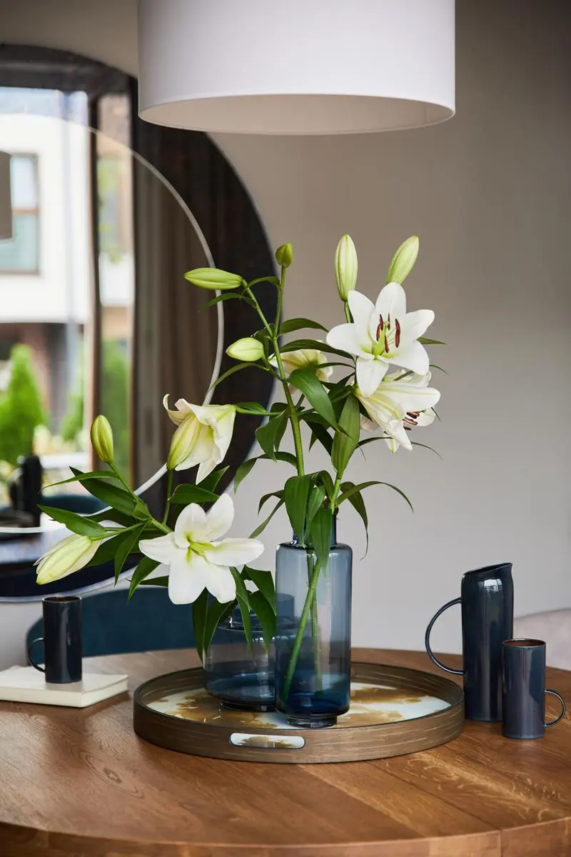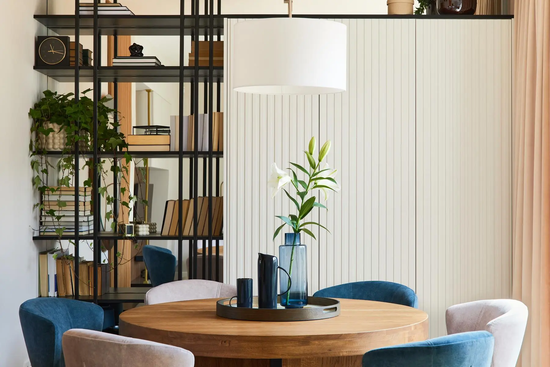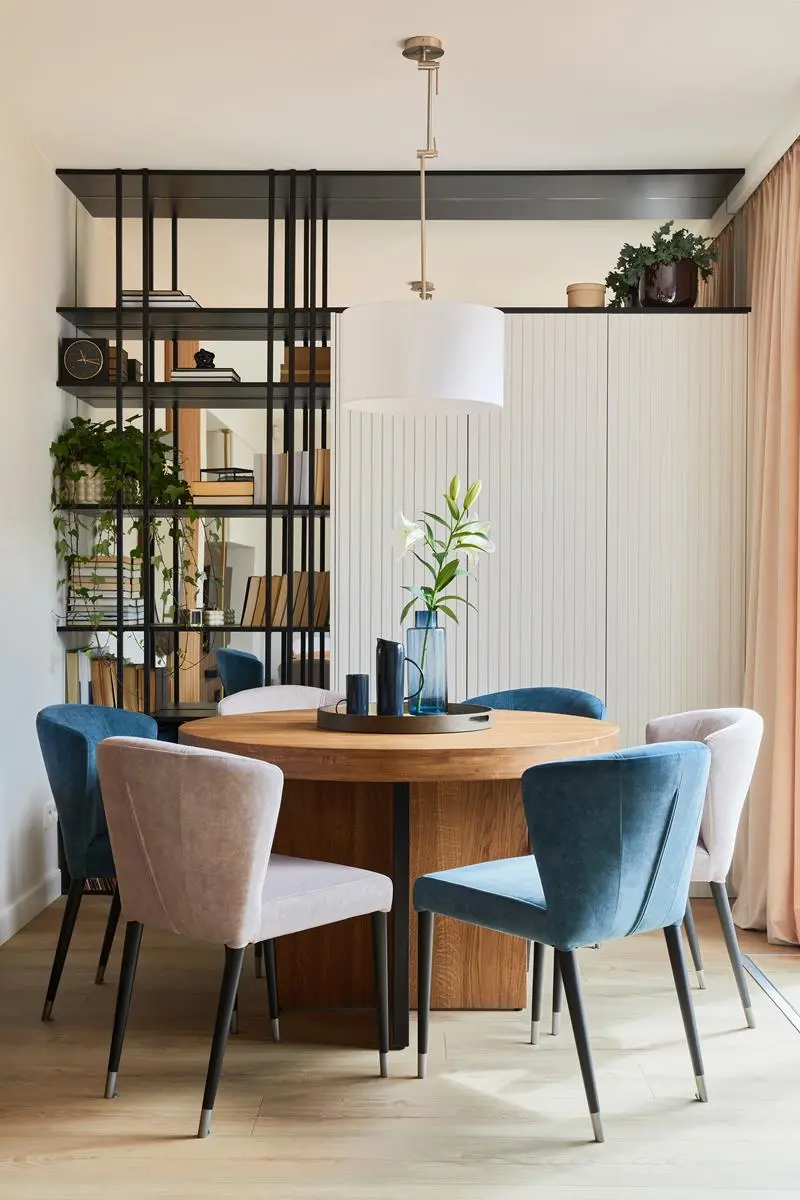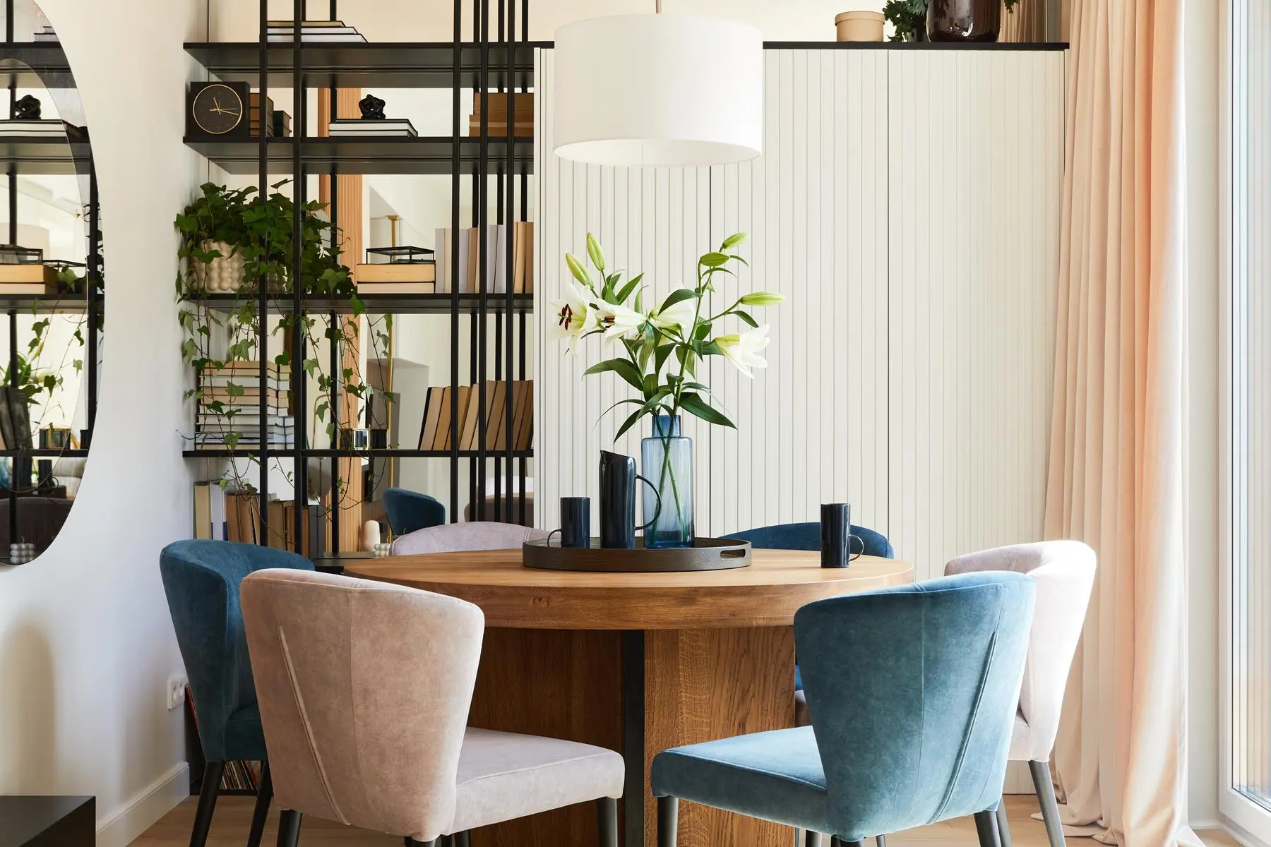 Jadalnia – niewielka, ale bardzo funkcjonalna. Baza to beże, czerń i drewno! To jeden z ulubionych materiałów architektki – ponadczasowy, pasujący do wszystkiego. A na pewno świetnie komponujący się z kolorem niebieskim, czyli obiciami krzeseł. Do tego ceramika w różnych odcieniach niebieskiego i mamy kompletną przestrzeń. Również w tej przestrzeni Pietras pomyślała o dużym okrągłym lustrze. Widać, że lubi bawić się nie tylko kolorami, fakturami, ale i kształtami. To powoduję, że wnętrze „żyje”. Nie jest monotonne. Wystarczy również spojrzeć na regał z książkami – jego plecy to również lustro!