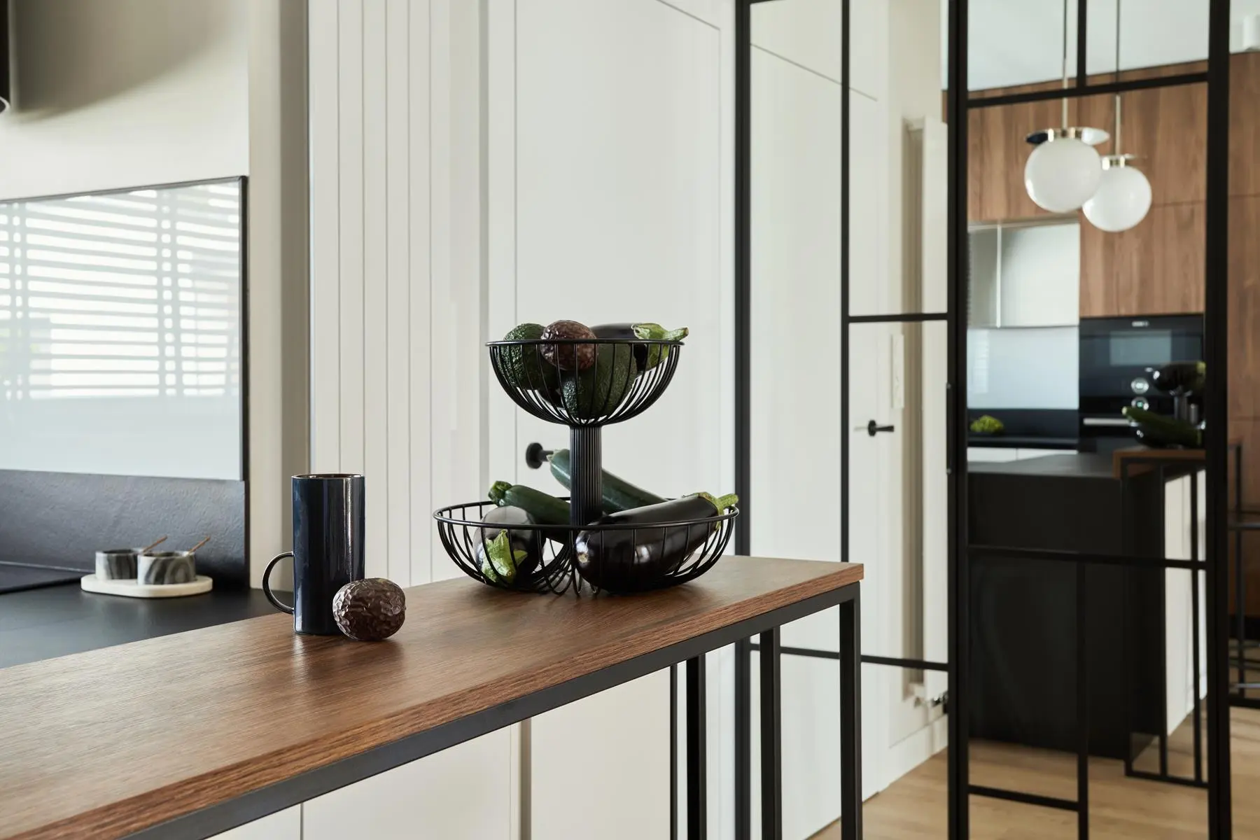 Kuchnia to przede wszystkim w ciemnym, czekoladowym kolorze drewniane fronty i wyspa kuchenna, osłonięta delikatną ażurową konstrukcją. W zestawieniu z bazą, czyli czernią i jasnym beżem tworzy, spójny obraz. A jednocześnie dodaje dynamiki wnętrzu. Warto zwrócić tu uwagę na ilość szafek i to o czym architektka wspominała wcześniej – lustra. Odbijają światło i powiększają przestrzeń. O walorach dekoracyjnych nie wspominając.
