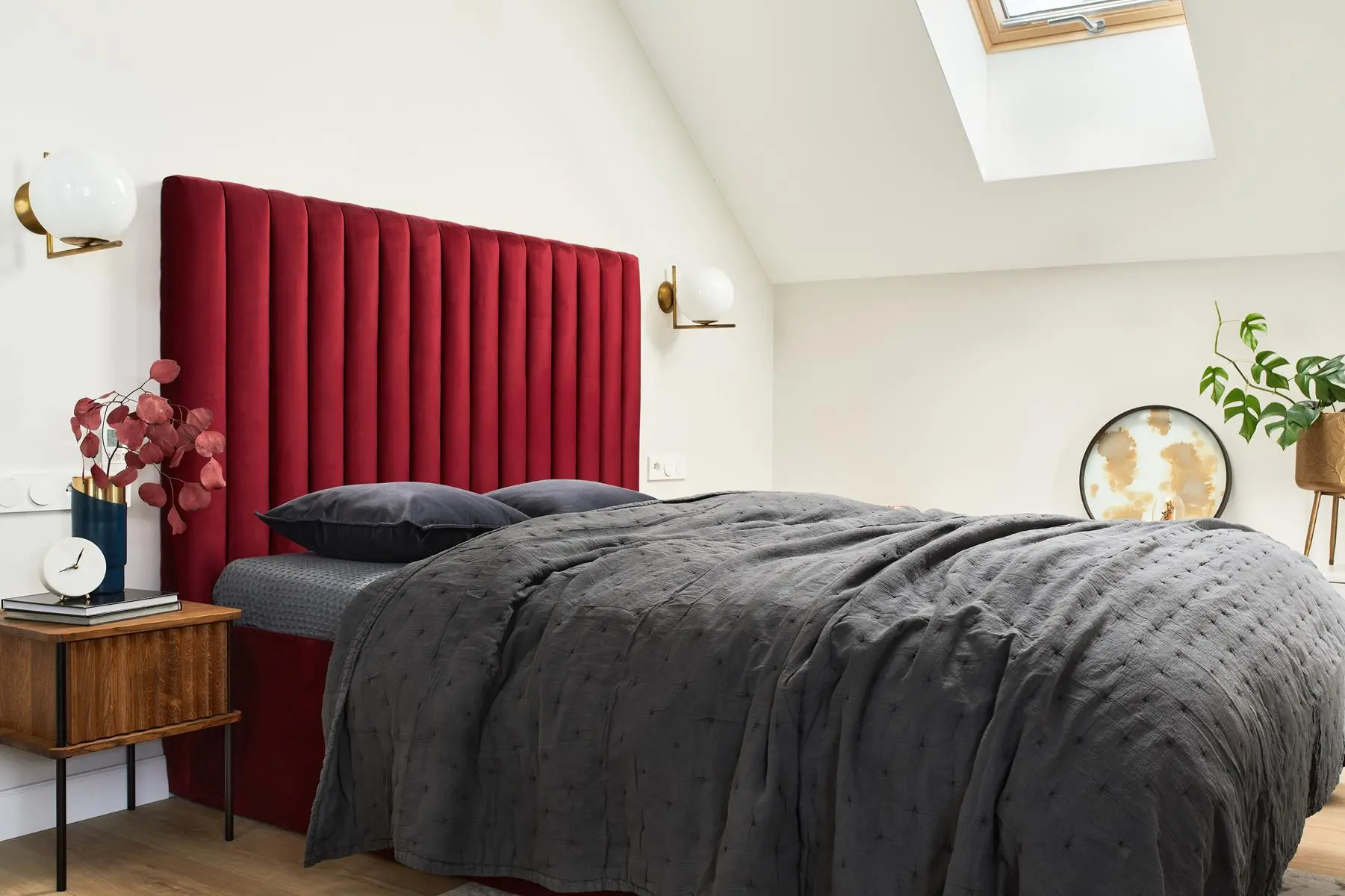 Bardzo podobny odcień czerwonego wina znajdziemy również w głównej sypialni. Tutaj połączono je z drewnem – dzięki temu wnętrze jest przytulne. Jak na miejsce relaksu przystało.