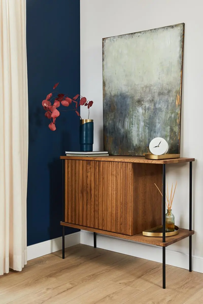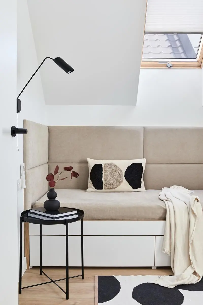 Dla właścicieli tego domu liczącego ponad 110m² ważna była funkcjonalność. A jak dokładnie to rozumieli? Duża ilość schowków! Szafki możemy znaleźć w nieoczywistych miejscach, np. pod skosami w łazience. Również stojąca w strefie dziennej szafa z pięknymi ryflowanymi frontami zaskakuje swoją pojemnością. Idealnie nadaje się do przechowywania obrusów, serwet etc. Kiedy więc architektka Hanna Pietras zadbała o część praktyczną — przyszedł czas na wizualną.