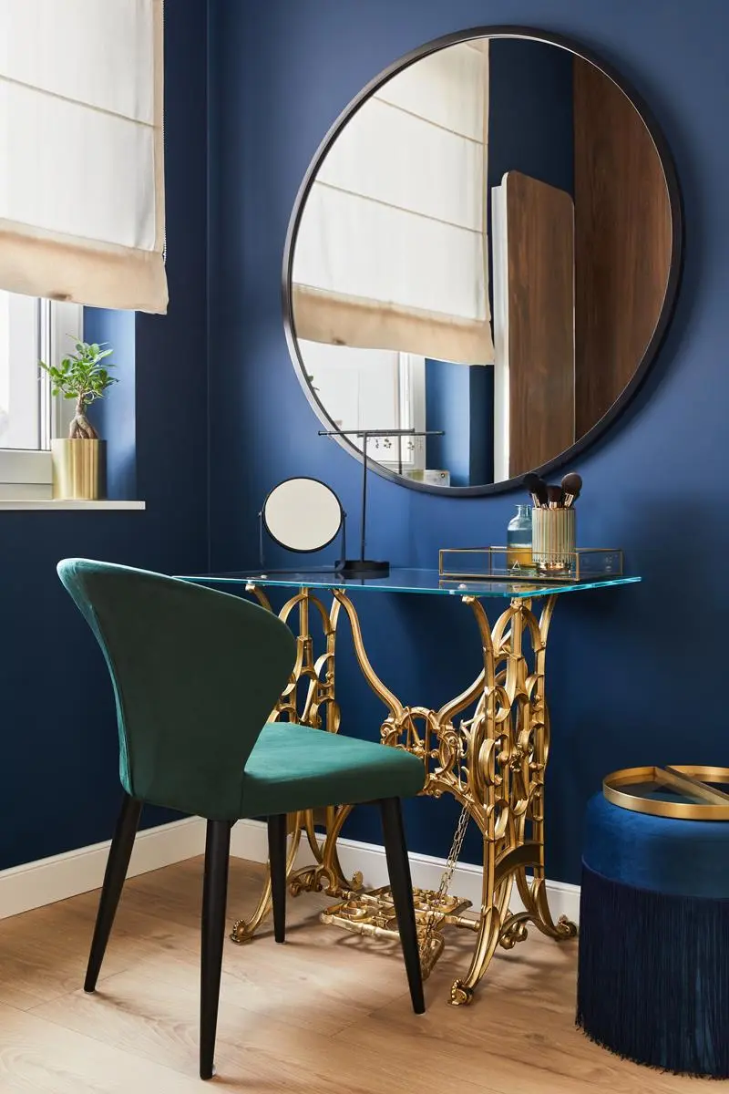 Dodatki i dekoracje w złotym wykończeniu są przysłowiową wisienką na torcie. Najbardziej kobiecym akcentem w całym domu jest toaletka, która powstała ze starej maszyny do szycia Singer. Złocone elementy i szklany blat nadają jej lekkości i czynią z niej zabytkową perełkę! Warto dodać, że ten mebel to było pomysł i wymarzone miejsce Inwestorki.