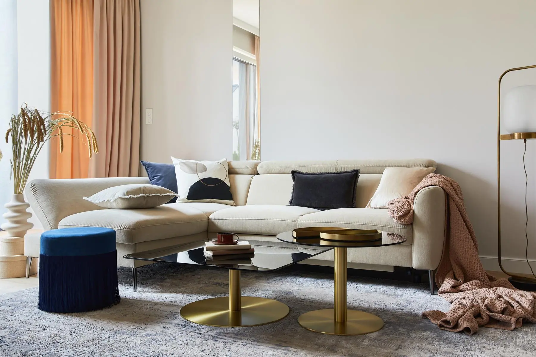 Koło tego salonu nie można przejść obojętnie, nie jest duży, ale główną rolę odgrywa tu fotel ALEX z podnóżkiem marki SITS w kolorze bordowym. Uzupełnieniem jest granatowa pufa i łososiowe zasłony. Przysłowiową kropką nad „i” są złote akcenty – stoliki, lampa. Tu również Hanna Pietras postawiła na lustra a w zasadzie to lustrzany pas, który się ciągnie aż do sufitu po ścianie. W tej odległości od okna powoduje, że do wnętrza wpada zdecydowanie więcej światła naturalnego.