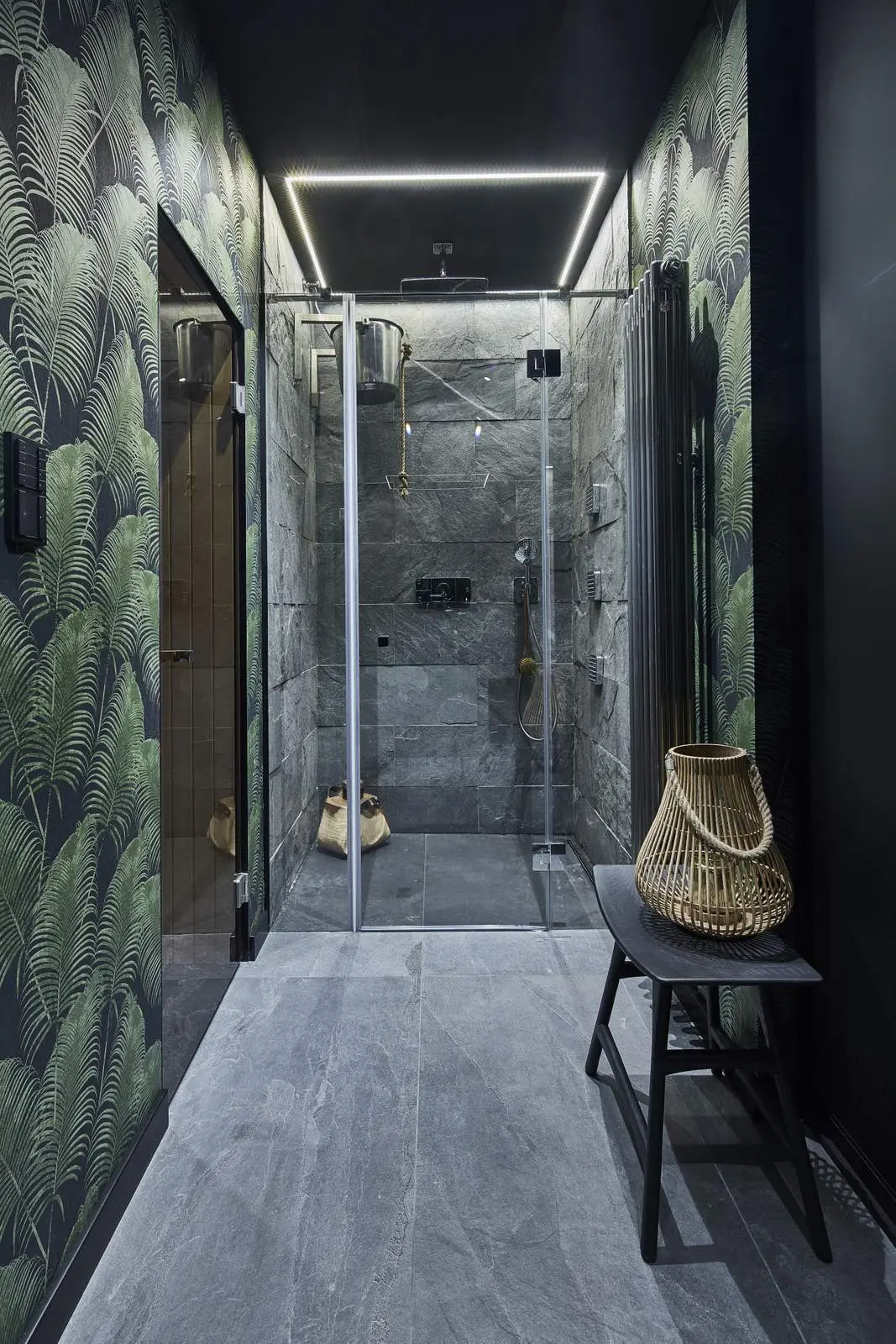 Łazienka z sauną to wyjątkowa przestrzeń w mieszkaniu. Oddaje hołd naturze. Cudowne połączenie tapety w liście i płytek nawiązujących do skał bazaltowych. Nieoczywista łazienka hipnotyzująca swoim wyglądem.