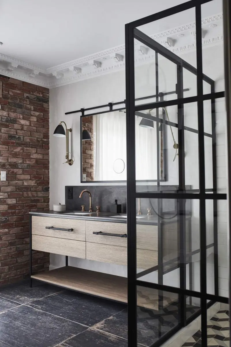 Druga łazienka nawiązuję swoim wyglądem do paryskich kamienic z elementami industrialnymi. Tak bardzo charakterystyczne minimalistyczne płytki na ścianie, podkreślają piękno loftowych lamp, kabiny prysznicowej i postarzanej deski podłogowej. Ciekawym zabiegiem aranżacyjnym jest zastosowanie dwóch kolorów baterii stylizowanych na retro. Bateria prysznicowa i wannowa jest matowa czarna a w strefie umywalkowej postawiono na postarzane złoto.