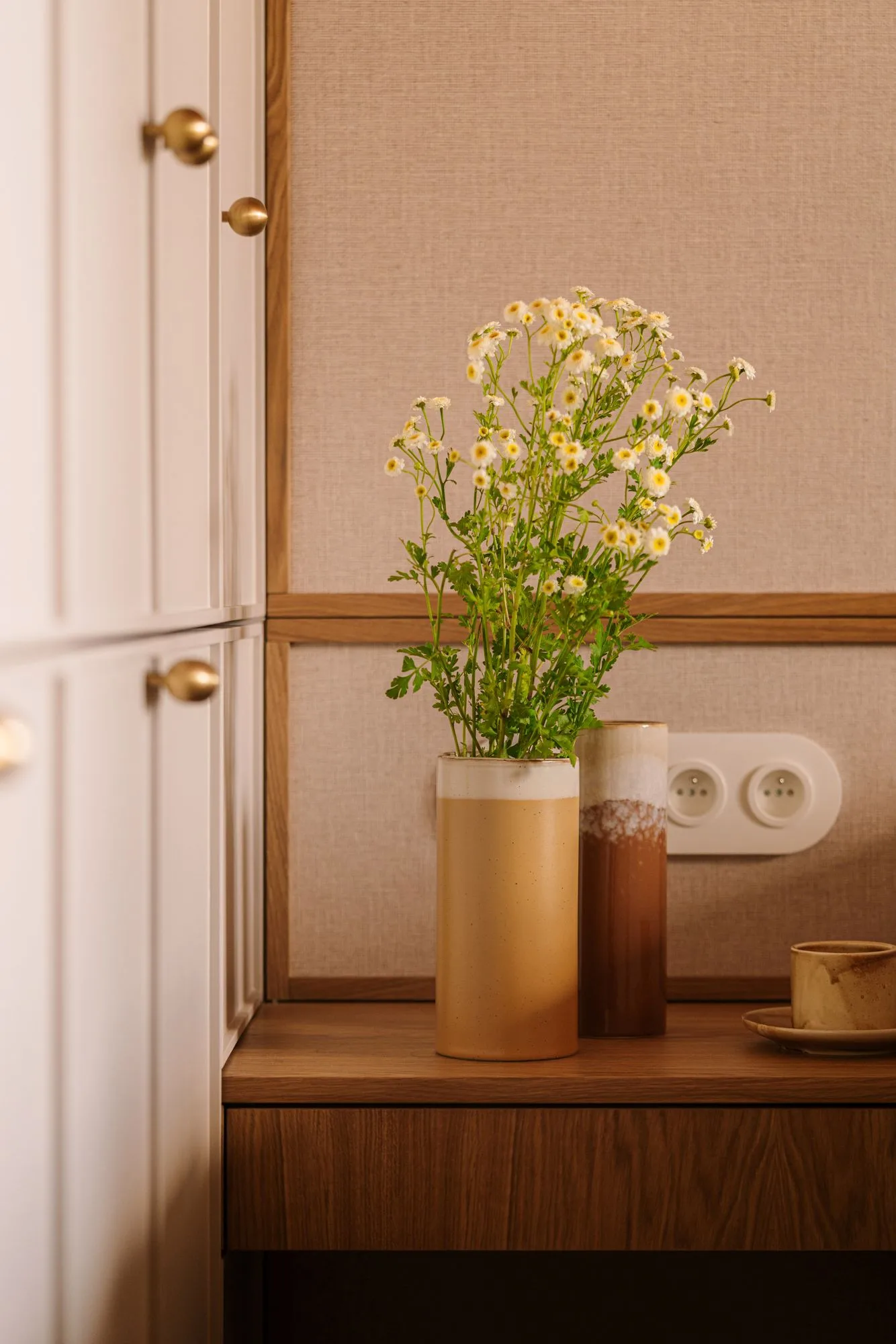 Długi korytarz był dla właścicieli początkowo wyzwaniem. Projektantki rozwiązały ten problem z gracją, dzieląc przestrzeń na sekwencje i tworząc wrażenie scenografii teatralnej. Z jednej strony – ściana z kolorowymi kinkietami, których światło tworzy dynamiczne refleksy, jak świetlny poemat. Z drugiej – lekka beżowa zabudowa i kontrastująca, głęboka antracytowa ściana, która zatrzymuje wzrok i nadaje rytm. Efekt? Korytarz, który nie prowadzi donikąd, ale zaprasza do kolejnych odkryć.