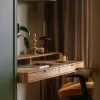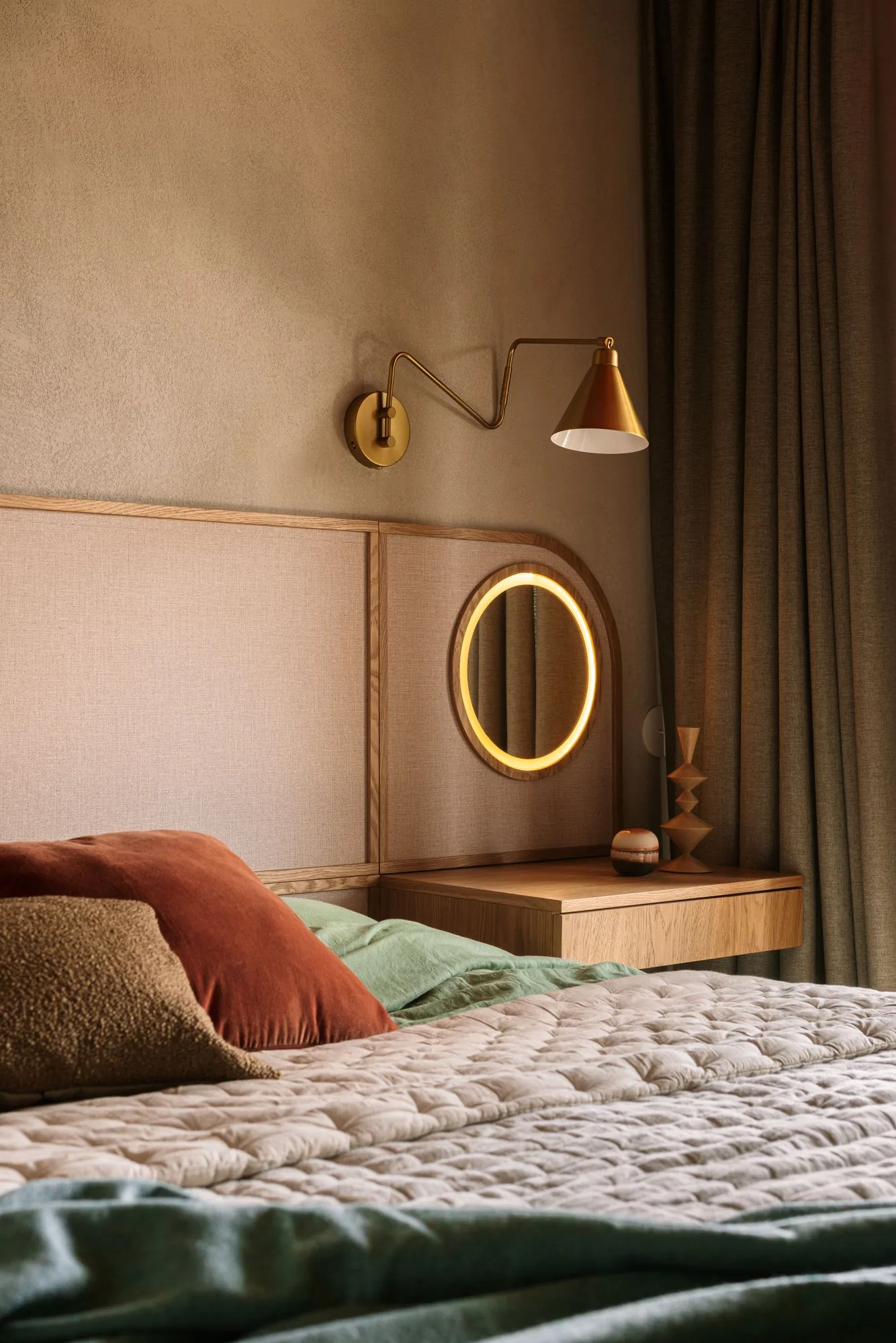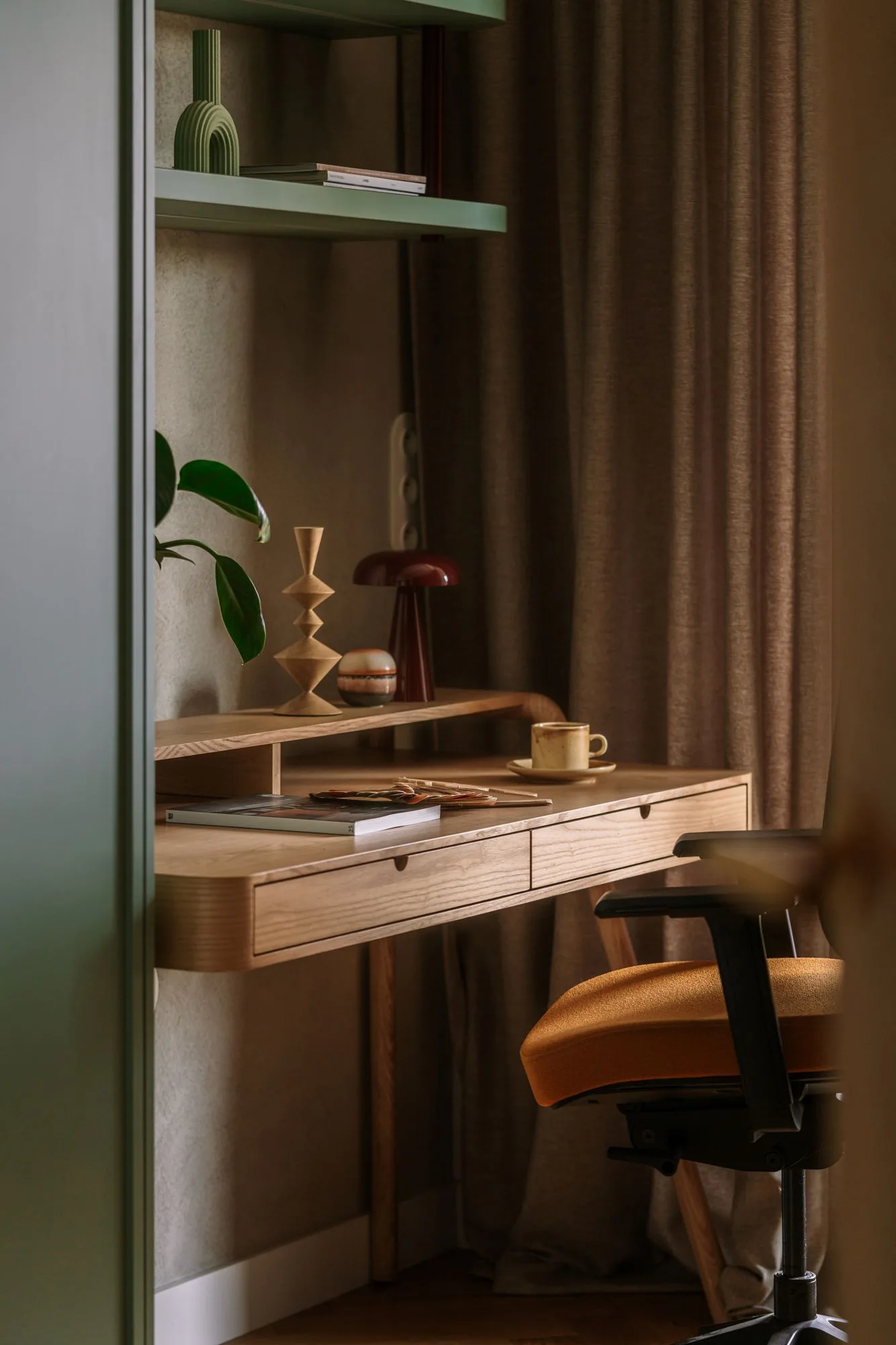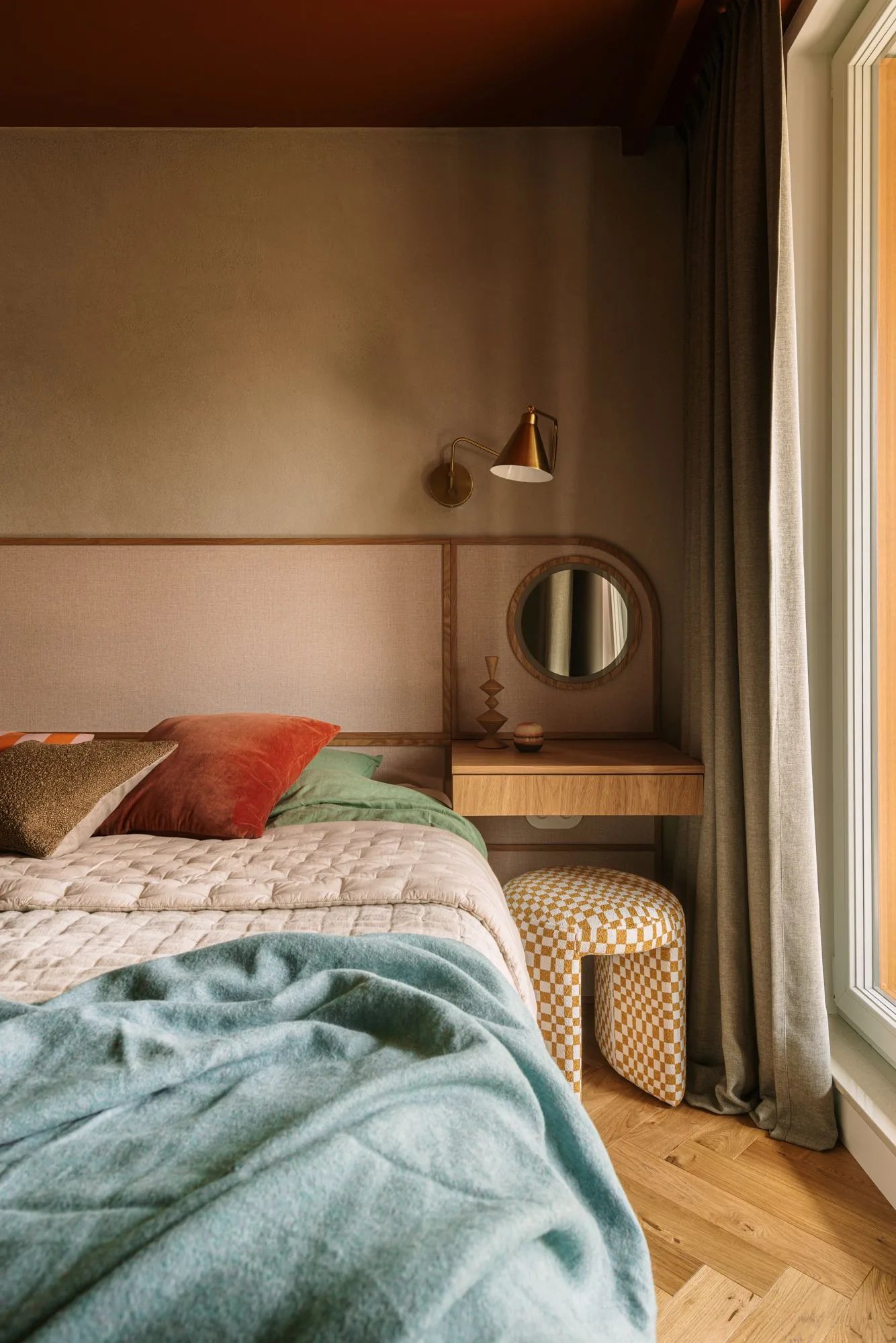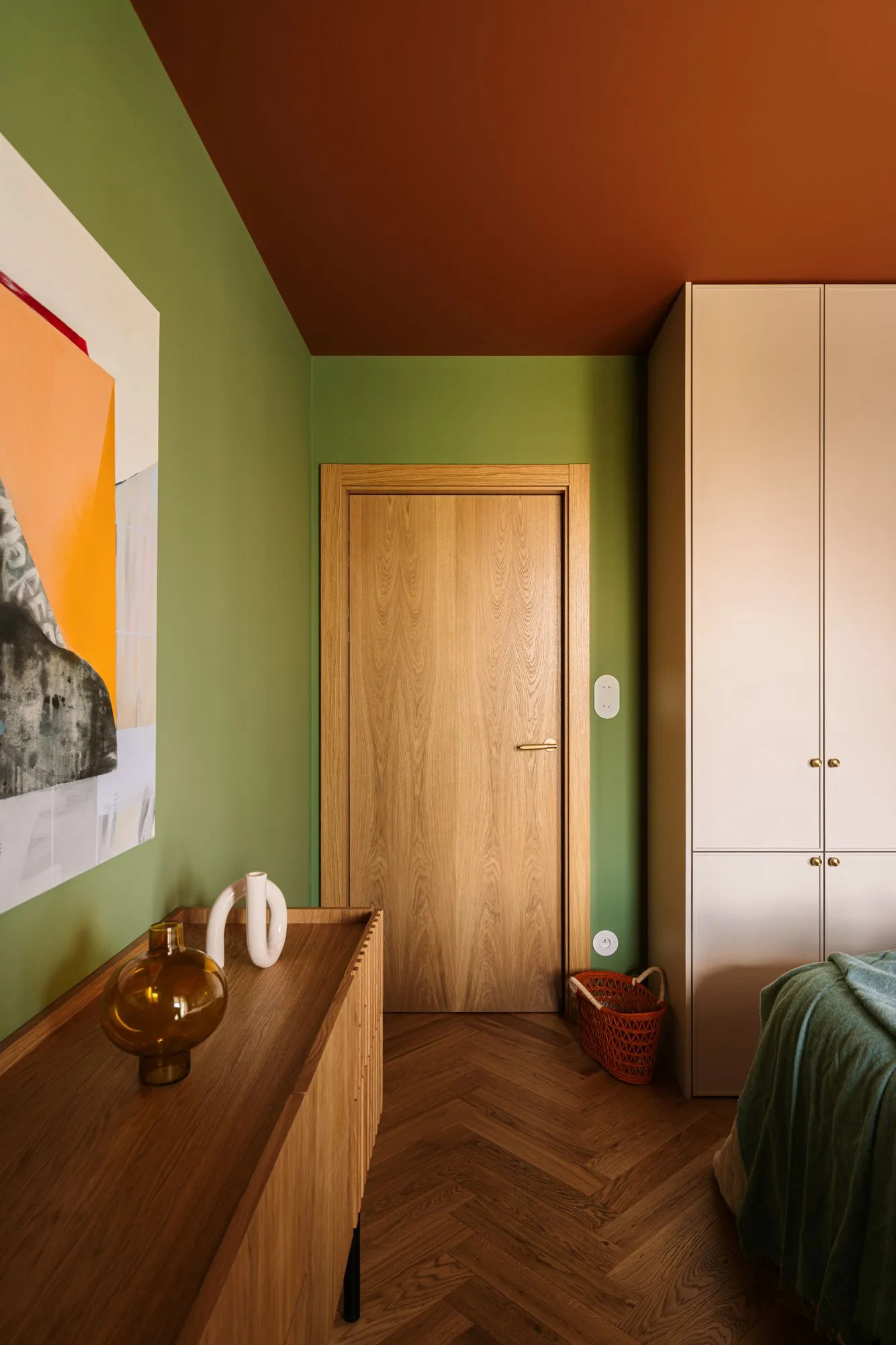 To wnętrze nie tylko zaskakuje – ono również koi. Sypialnia została skąpana w zieleniach – relaksujących, spokojnych – z akcentem w postaci rudego sufitu, który otula jak ciepły szal. Centralnym punktem jest tu zabudowa z zagłówkiem i toaletką – rozwiązanie, które łączy funkcjonalność z kameralnością. Sypialnia staje się azylem, a nie tylko pokojem z łóżkiem.