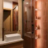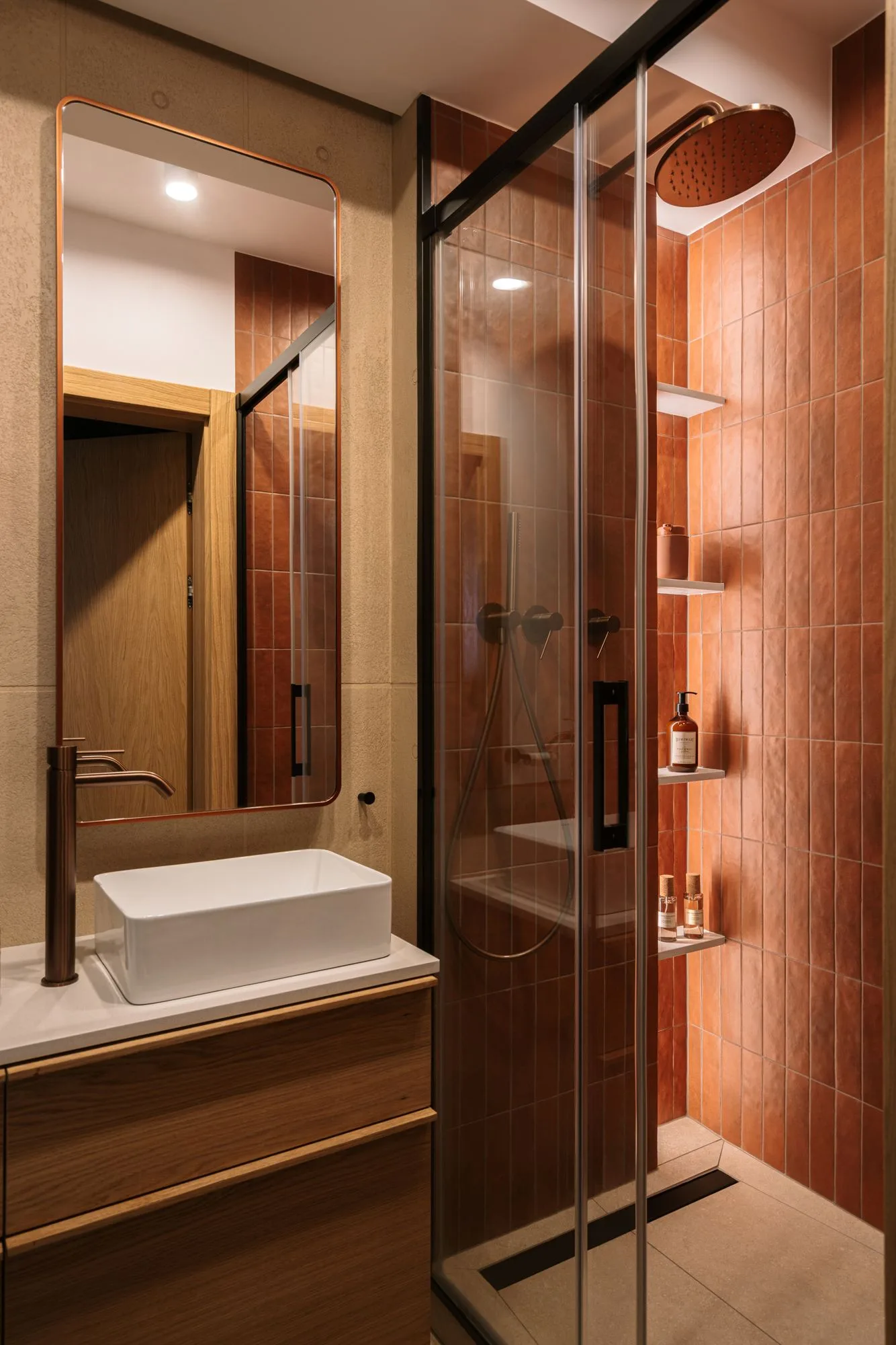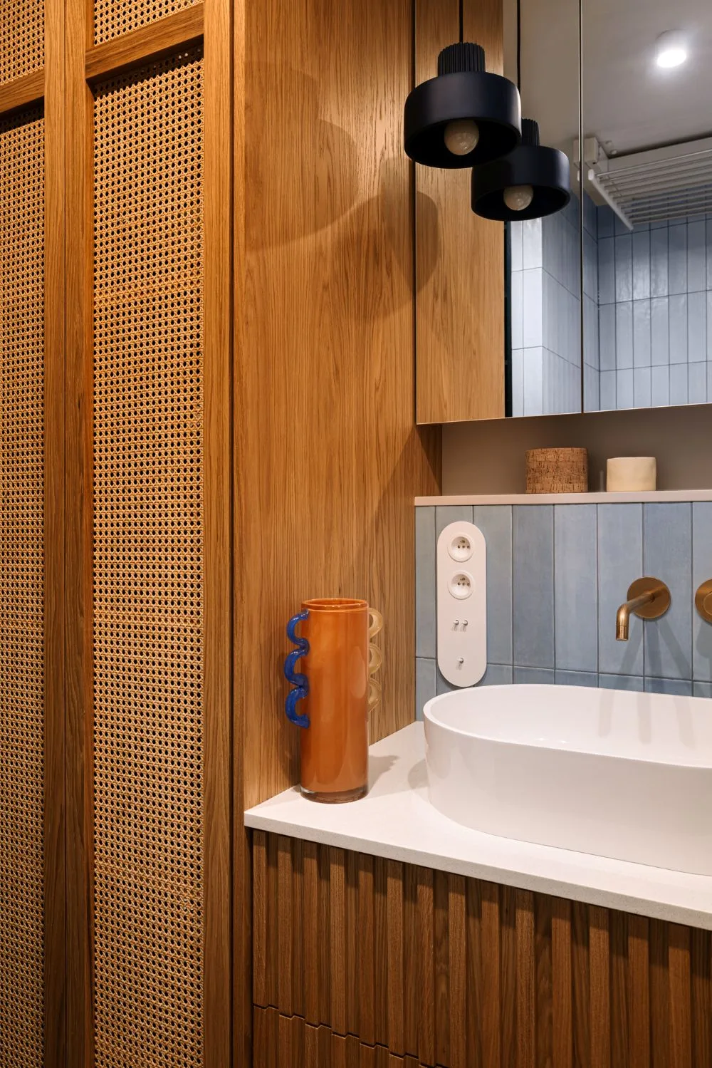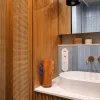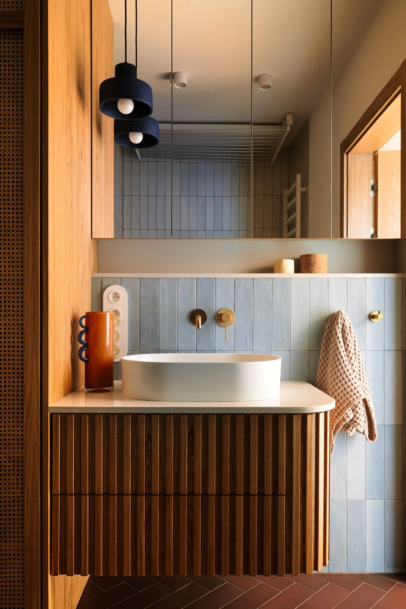 Łazienka z prysznicem to industrialna nuta z domieszką ciepła – ruda kolorystyka przełamana betonowym tynkiem i podświetlanym lustrem. Surowość spotyka elegancję, a efekt nie traci nic ze swojej codziennej użyteczności. Druga łazienka, z wanną, to już inna historia – kolorystyczna opowieść o bordowej podłodze, błękitnych płytkach i fornirowanych frontach w odcieniu denim. Pralka i suszarka? Owszem – ale sprytnie ukryte za zabudową z plecionką. Funkcja przebrana za estetykę.
