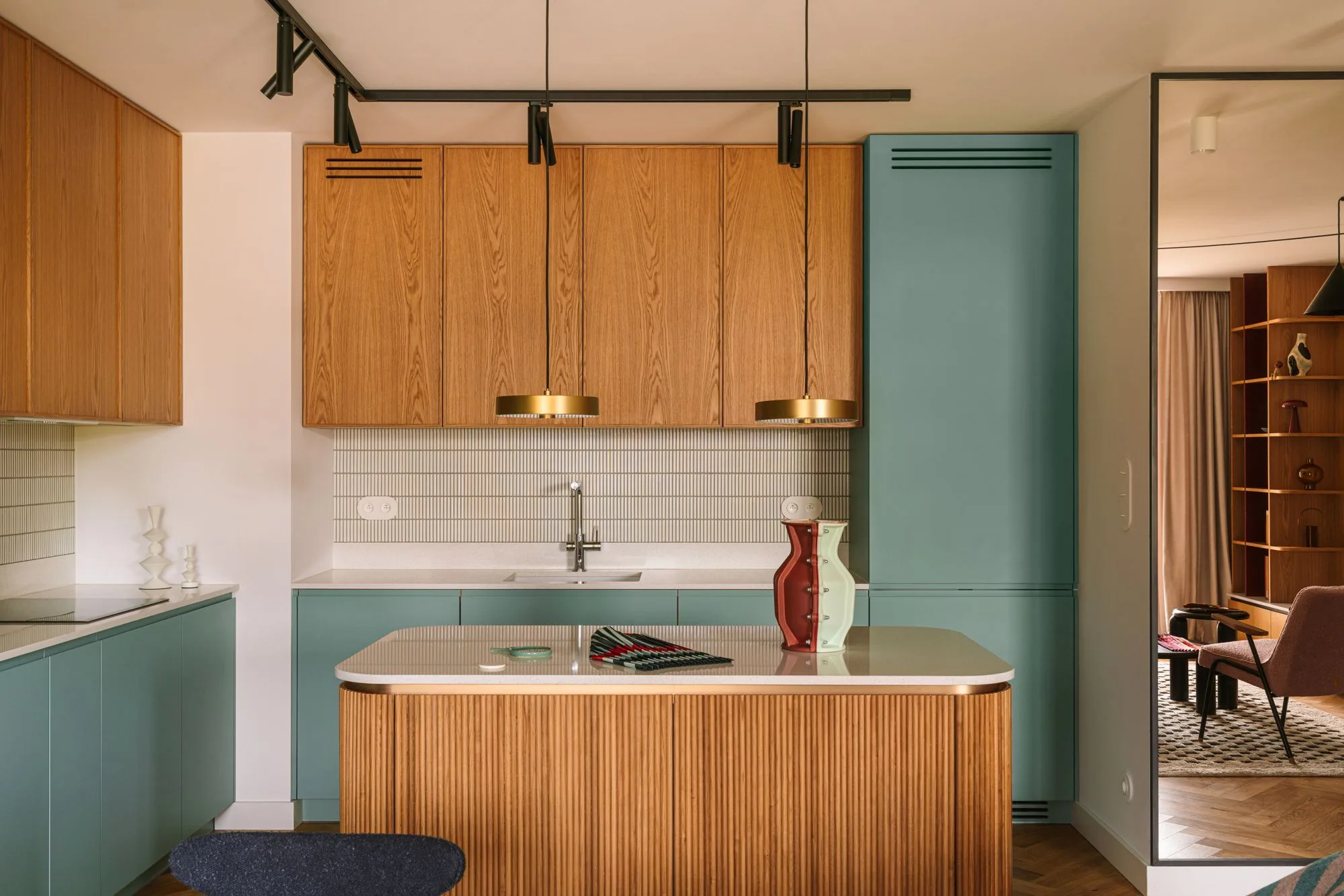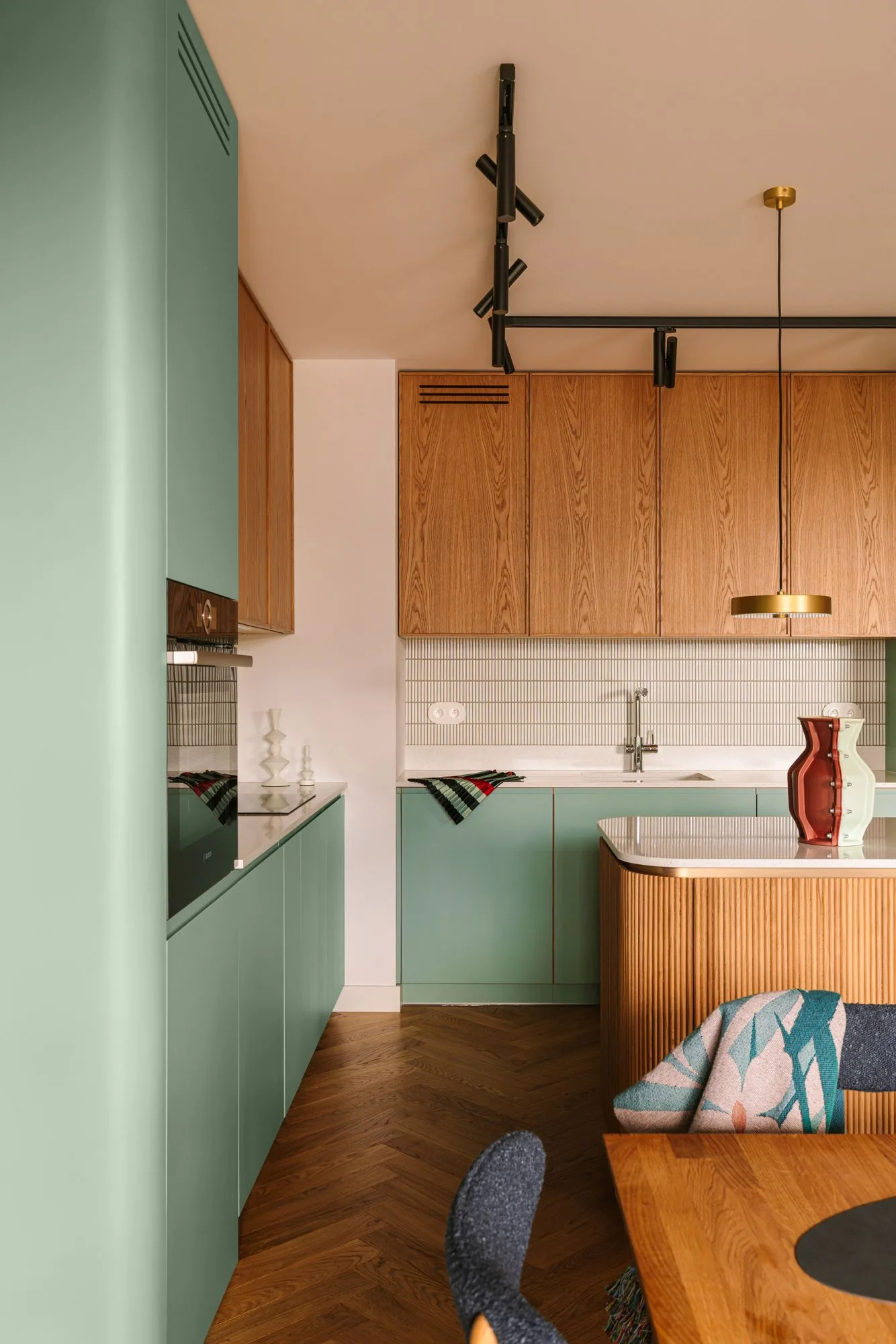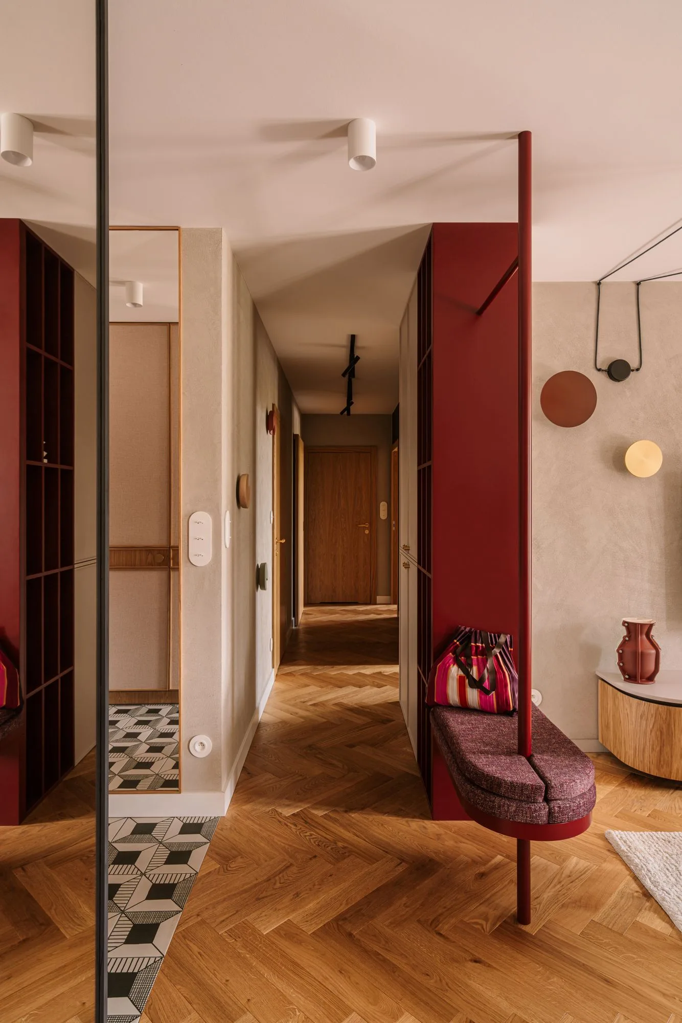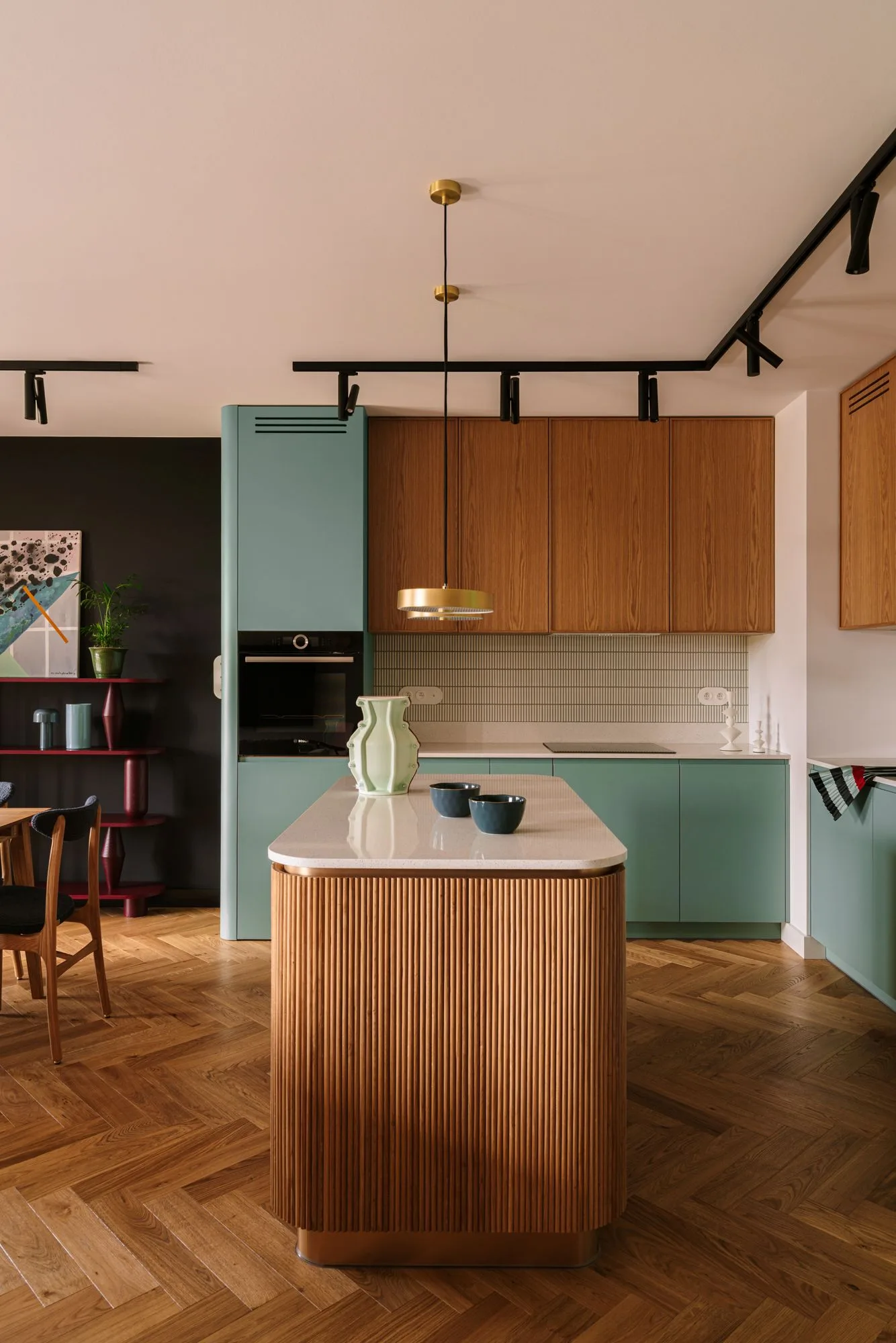 Paleta tego mieszkania nie jest przypadkowa. Zieleń, bordo, rudość i błękit to barwy świadome, odważne, ale nigdy krzykliwe. One nie dominują – one prowadzą narrację. Wzory, tekstury, światło – wszystko ma tu swoje miejsce, wszystko ma swoje dlaczego. Od geometrycznego dywanu po świetlne instalacje – mieszkanie żyje, oddycha i opowiada. A lampy? To nie tylko źródło światła, ale integralny element kompozycji. Te nad strefą wypoczynkową czy te w korytarzu to nie dodatki – to aktorzy pierwszego planu.